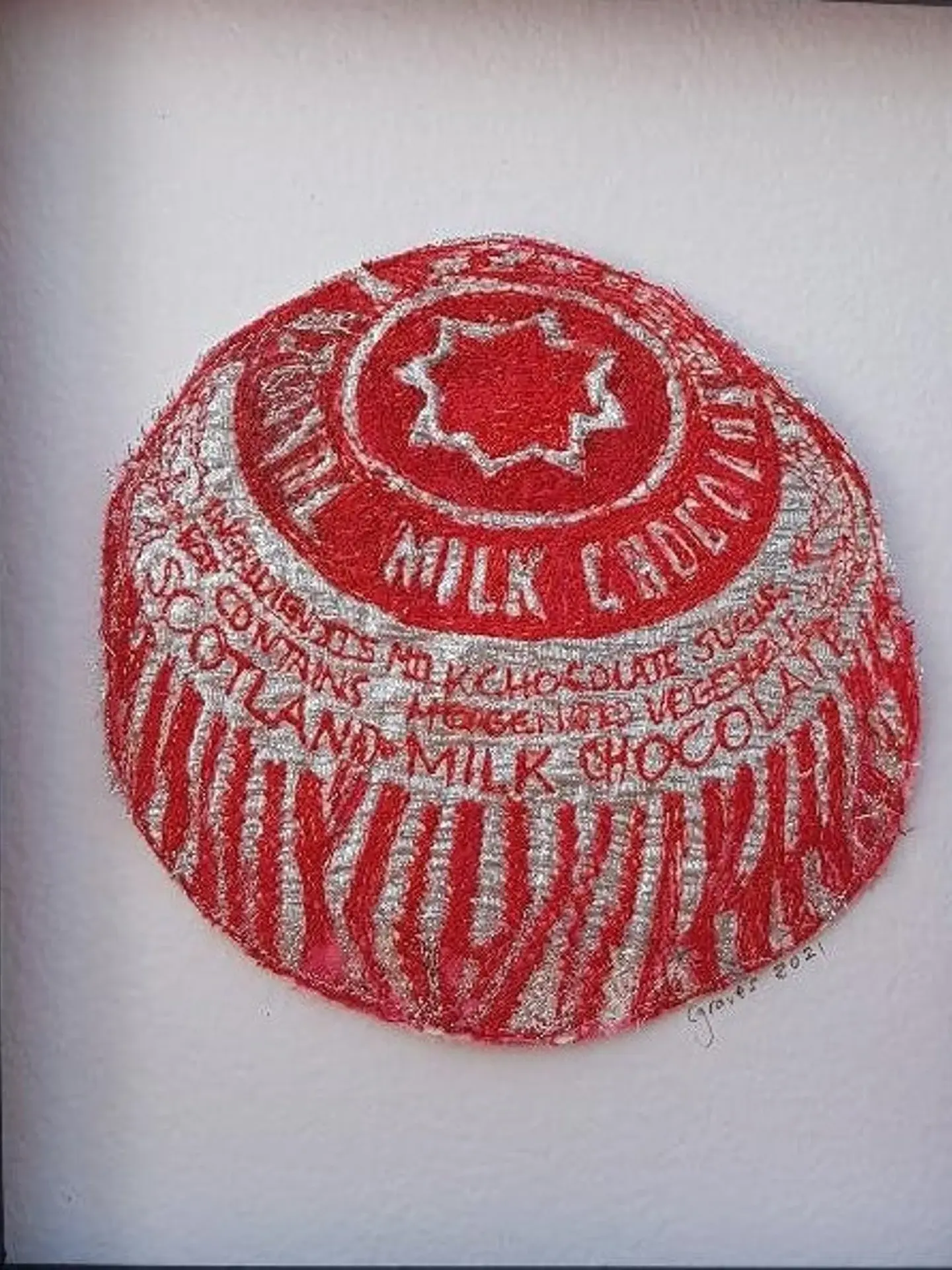 This handmade artwork is inspired by the classic Tunnock’s Teacake, created using Free Motion Embroidery and appliquéd silver lamé fabric. I carefully hand-paint on top of the embroidery with fabric paints to add depth, shine, and extra detail.