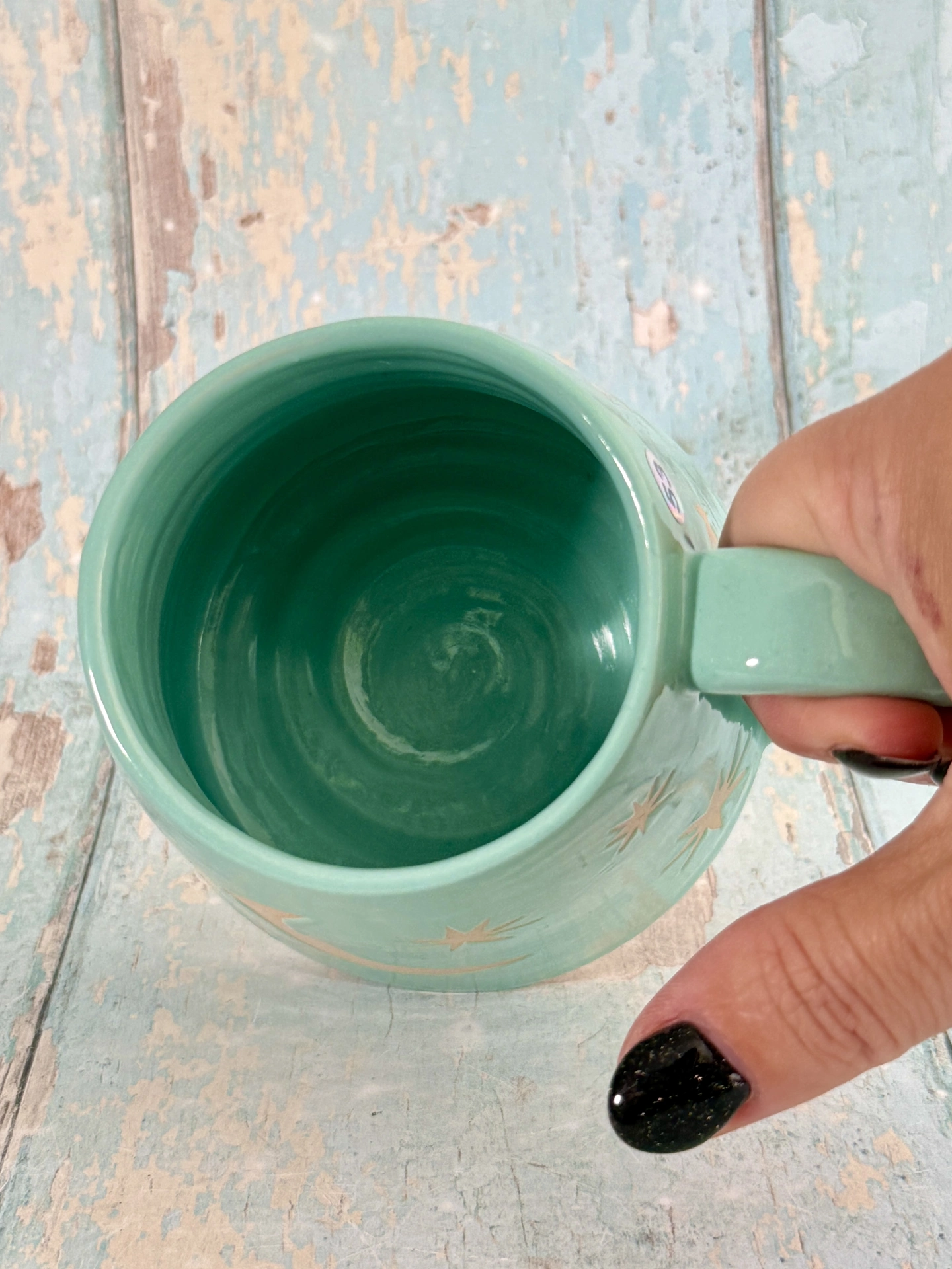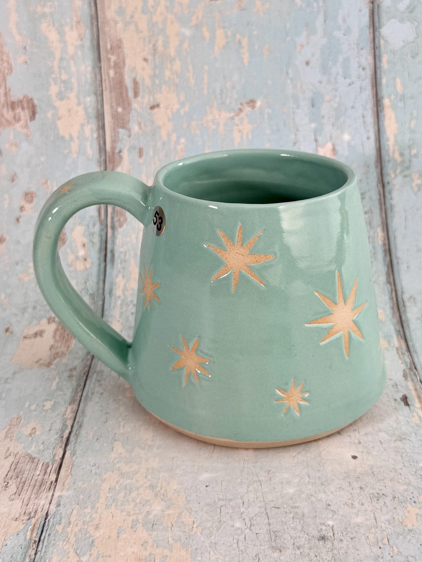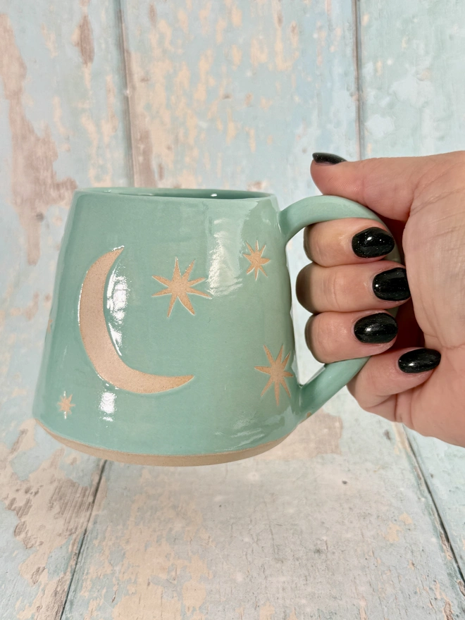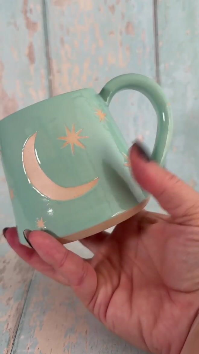 This large handmade aqua turquoise star and moon mug is made with white stoneware clay and a glossy glaze.