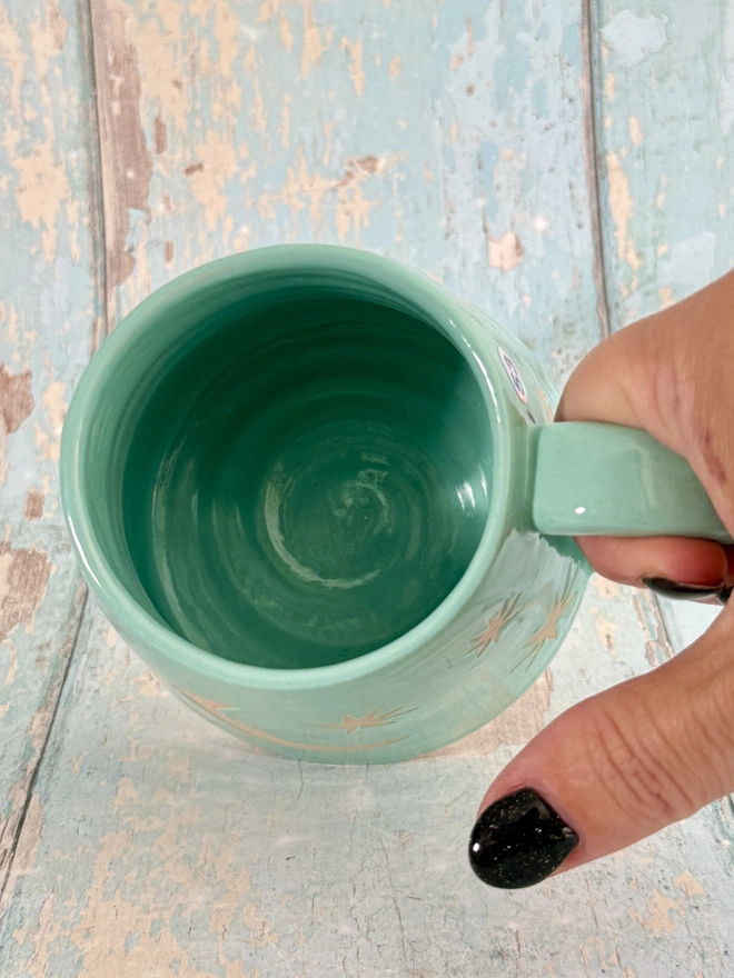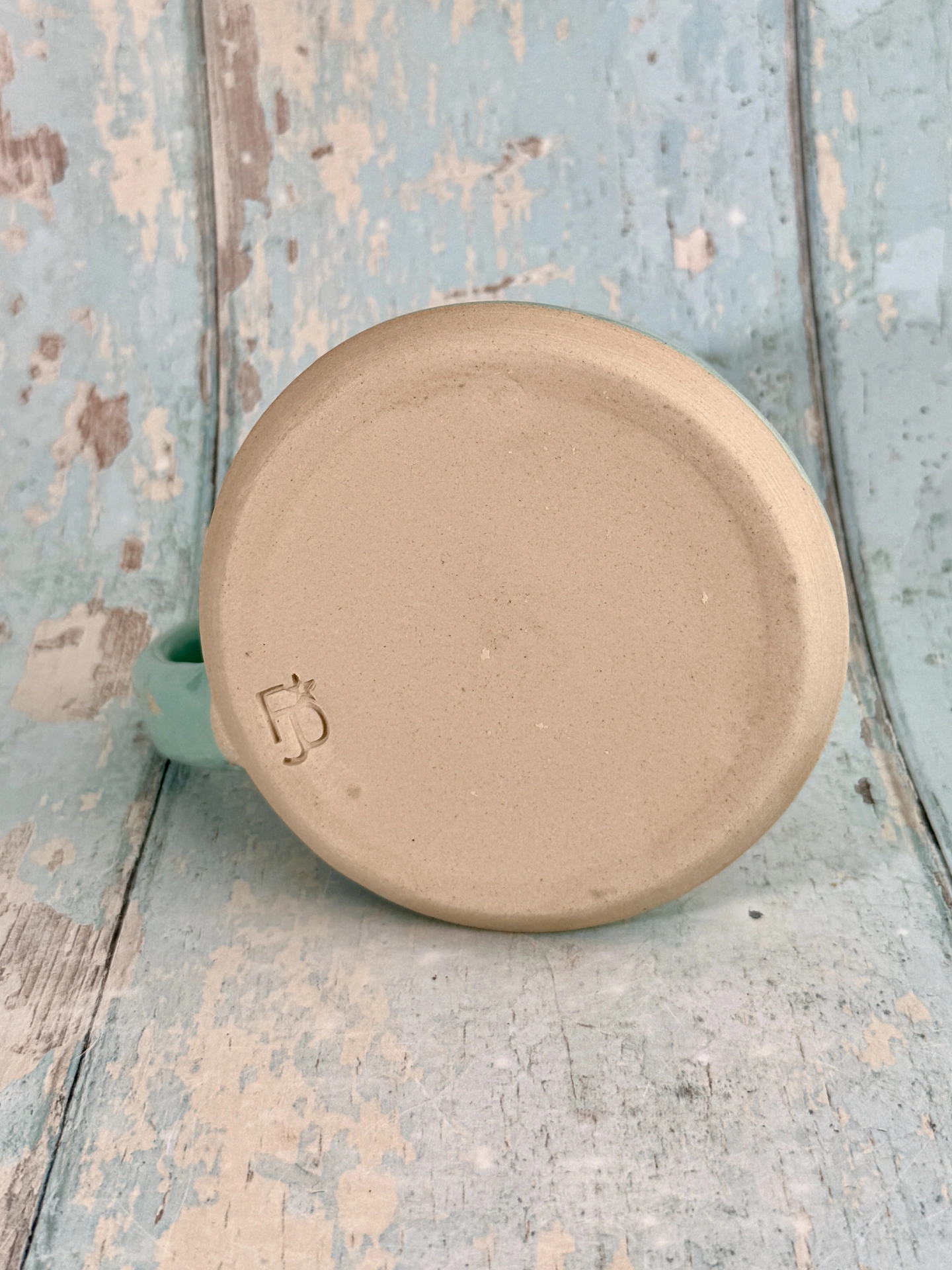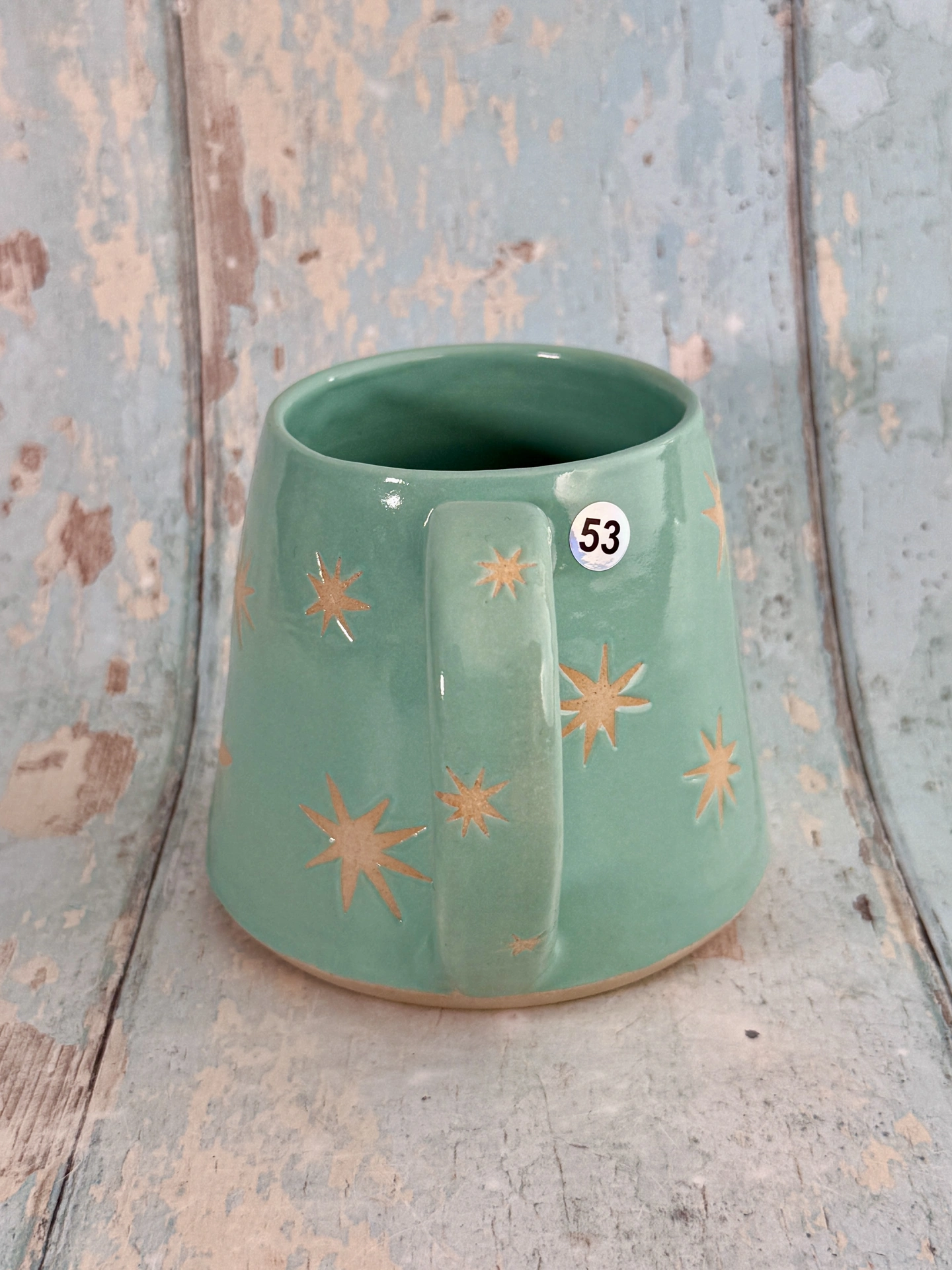 This large handmade aqua turquoise star and moon mug is made with white stoneware clay and a glossy glaze.