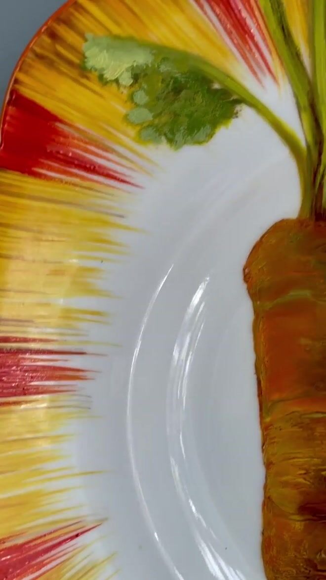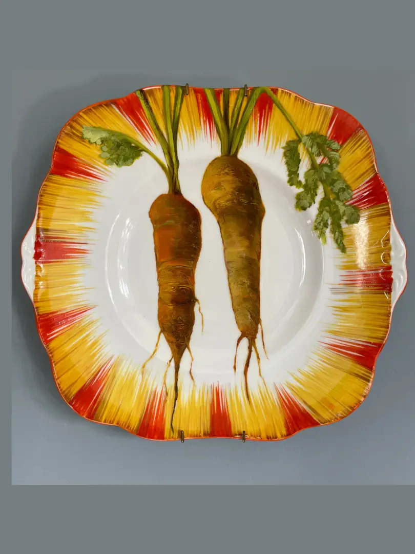 An original fine art painting featuring 2 carrots. Oil painting by renowned artist Jac Scott, on a cake plate with hand painted decoration, made by A. B. Jones Ltd, on the Grafton Works, England in the 1930s...