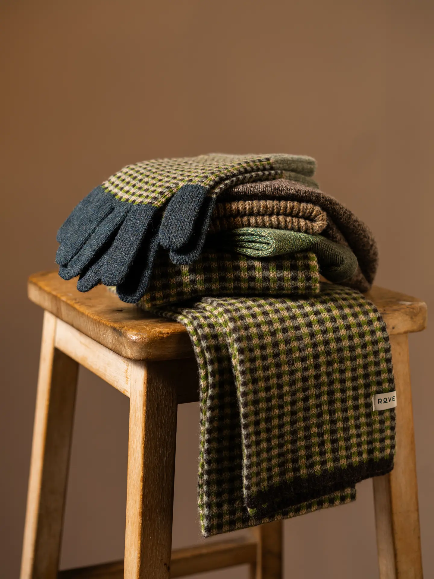 The double-thickness ribbed cuffs provide maximum warmth around the wrists, keeping cold air out while allowing your fingers to move freely. Designed to make a matching set with our Small Check Scarves, with a regular check and a subtle pop of Matcha Green.