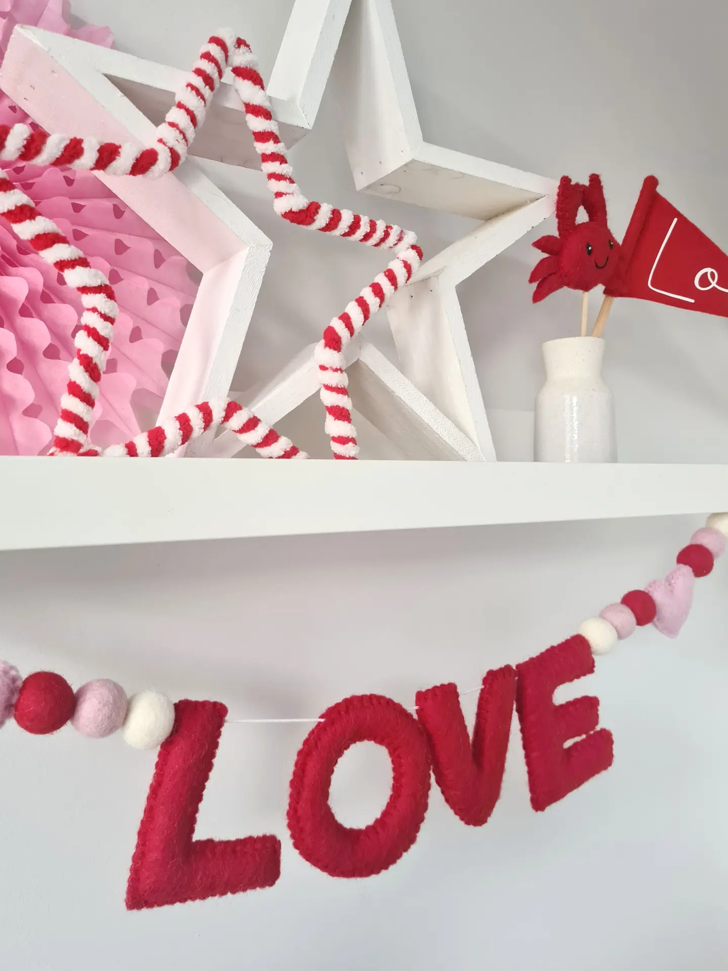 Each red letter is handmade in Nepal using New Zealand felt wool and measures approx 8cm in height. They are then hand strung in my studio onto a continuous length of strong white waxed cotton cord, complete with hearts and felt balls, and finished with a loop at either end for ease of hanging.