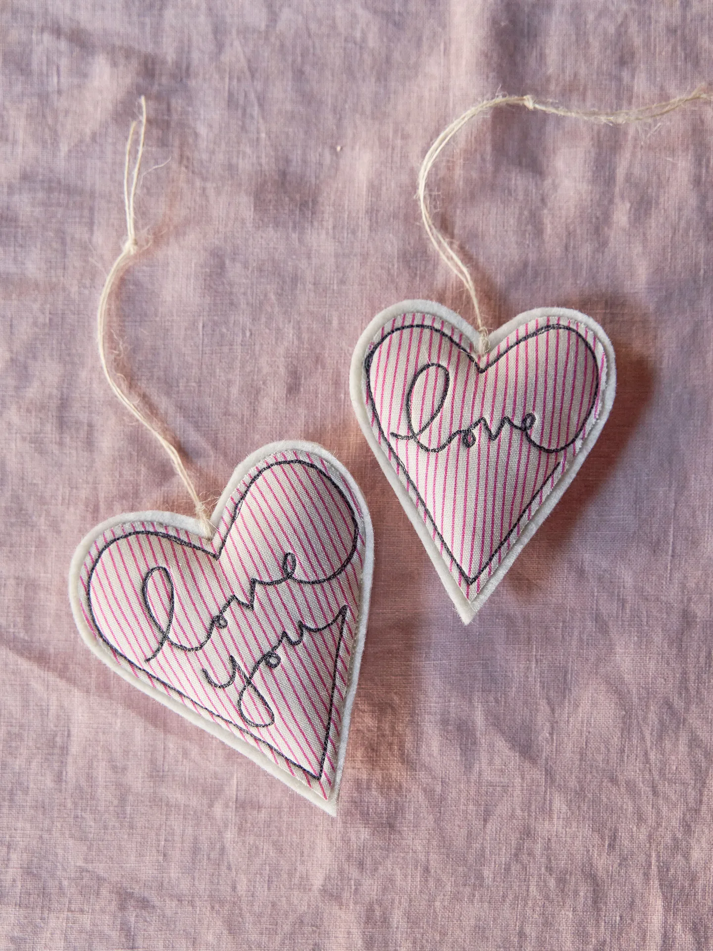Made by free motion embroidery onto a deep pink and cream striped fabric with a natural cord hanging loop.