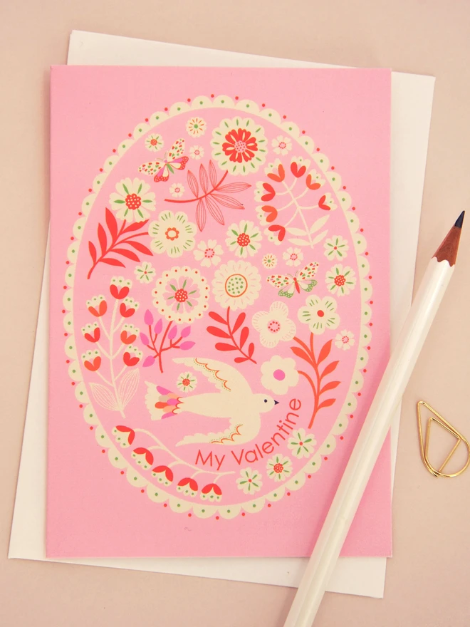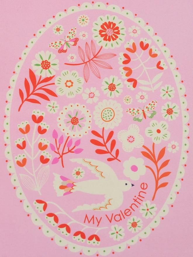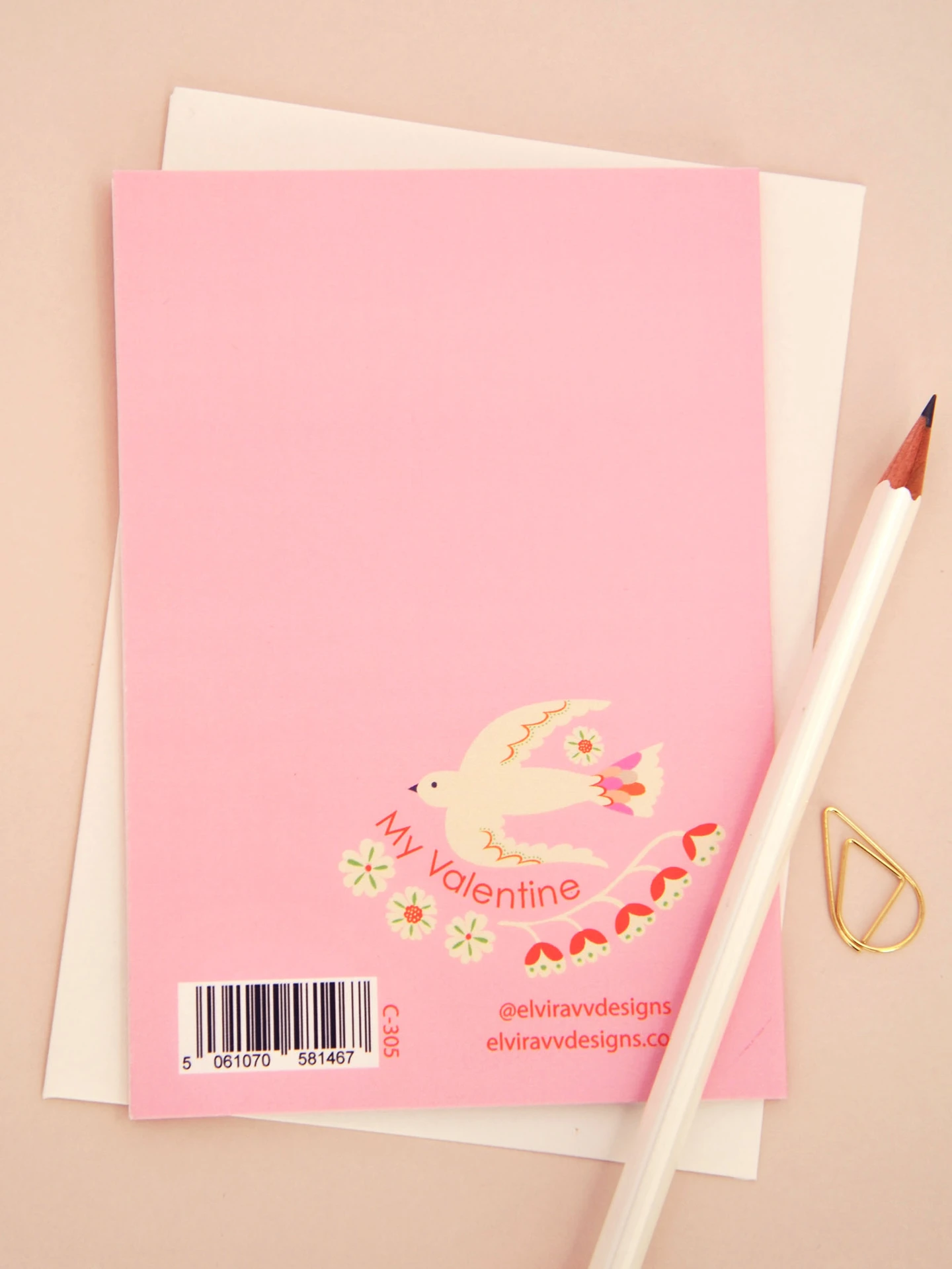 A beautifully illustrated Valentine’s card celebrating love in a soft, thoughtful way. Featuring a delicate bird surrounded by blooming flowers and framed with a charming decorative border, this design feels gentle, romantic, and timeless.