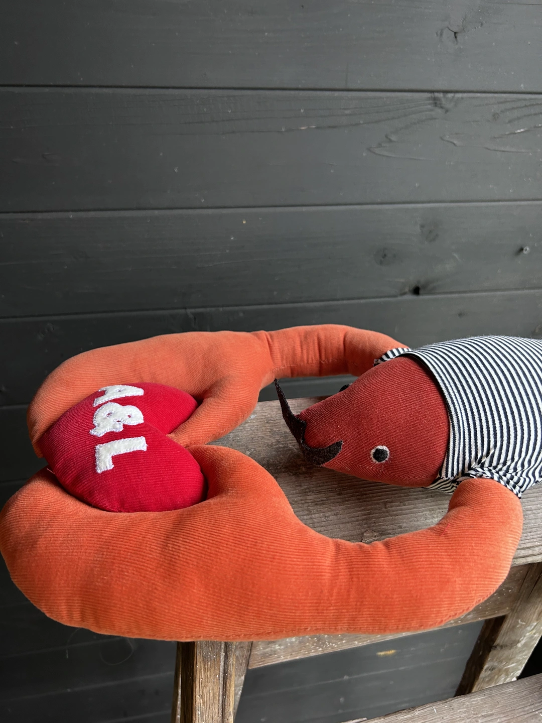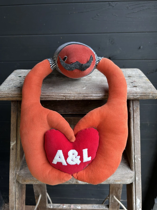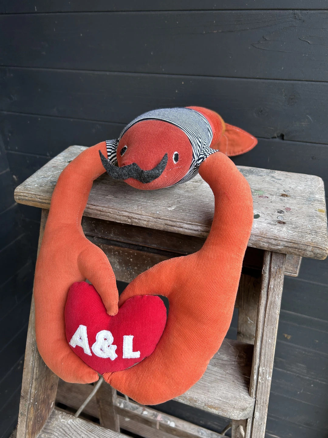 Lovingly hand crafted in my studio on the Isle of Wight, this stripy loving lobster wears his heart on his sleeve ( well, in his claws) making him the perfect gift this Valentines Day. Not only is he the most stylish of lobsters with his striped t shirt and perfectly trimmed moustache but the red velvet heart that he holds ever so gently in his claws is made to personalised with your choice of initials (or can be left blank if you would prefer) making him truly one of a kind. And because you know exactly where he’s made you can give this gift knowing it’s sustainable and long lasting. We’re talking heirlooms here, not landfill.