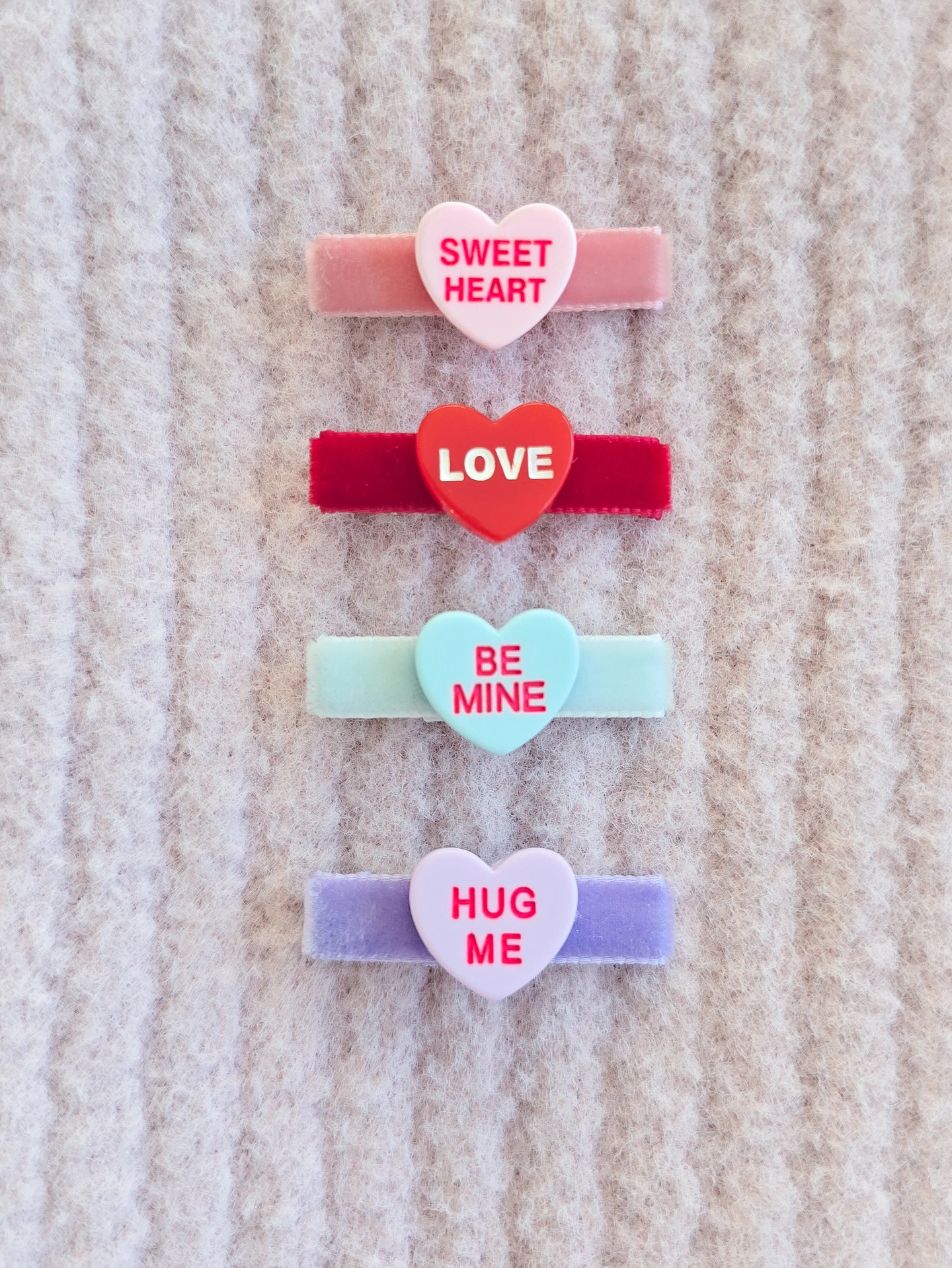 Each set includes four Love Heart clips (4cm velvet alligator clips):