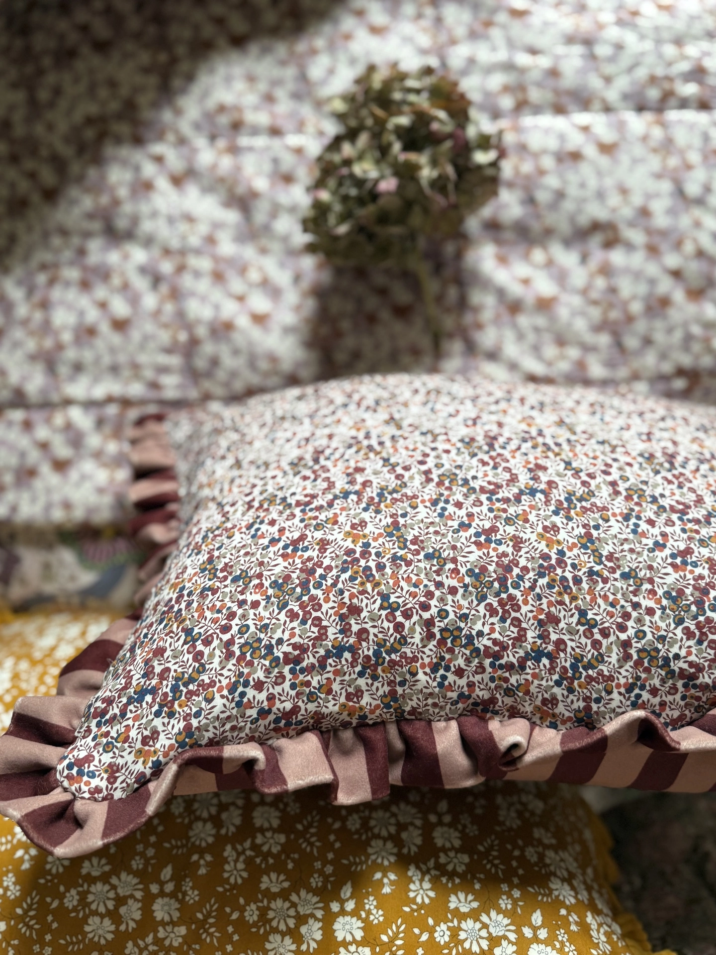 Velvet Ruffle Cushion in Liberty fabric 'Wiltshire'