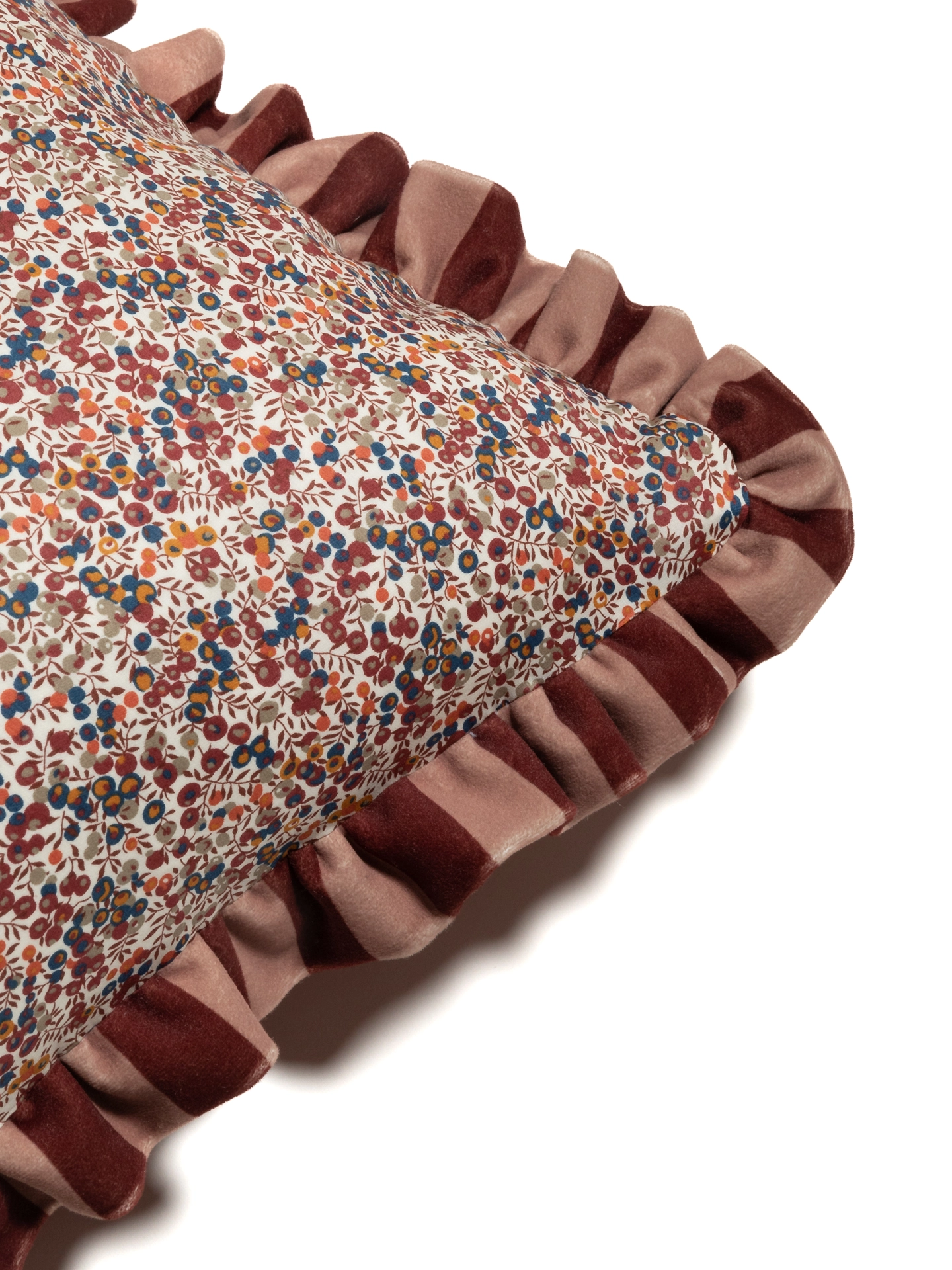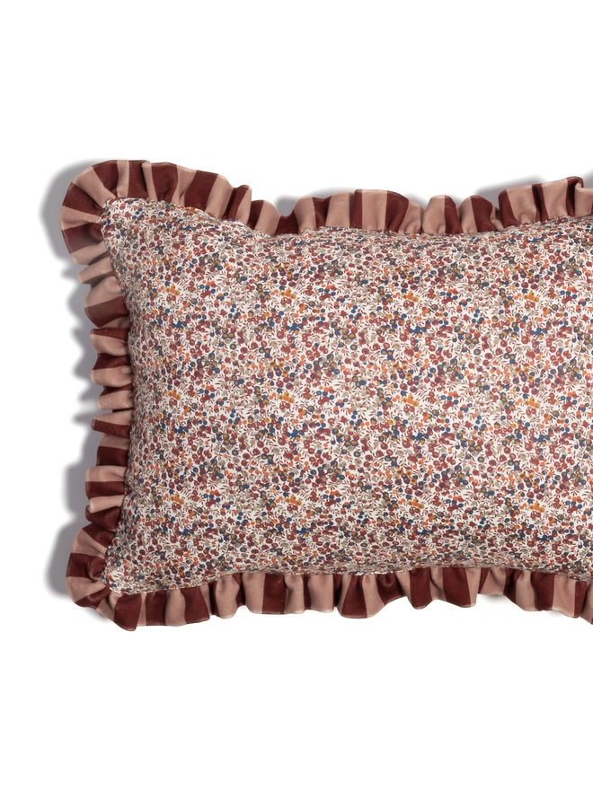 This beautiful cushion features the classic Liberty fabric ‘Wiltshire Bud’ with a striped velvet ruffle. The sumptuous velvet continues on the reverse side of the cushion...