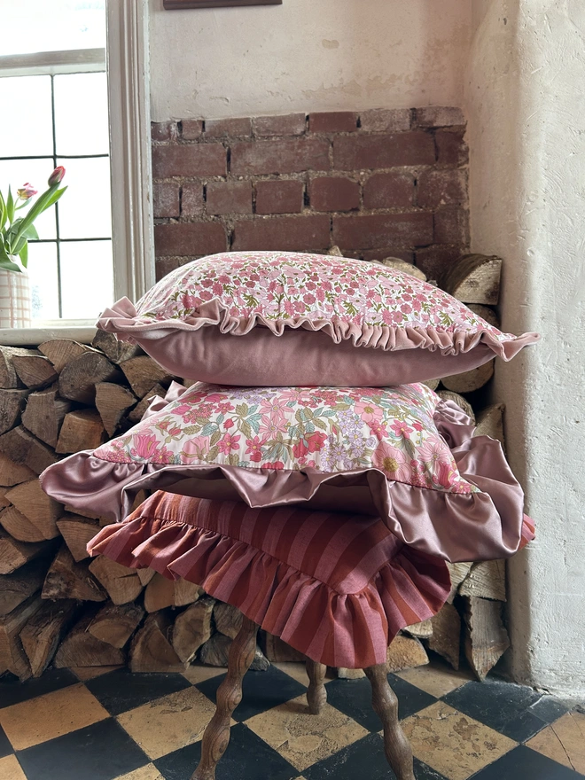 This truly scrumptious cushion is handmade from Liberty of London fabric ‘Clarabell’ and finished with a decadent frill in dusty pink satin. This pretty cushion will add a playful touch to any room.