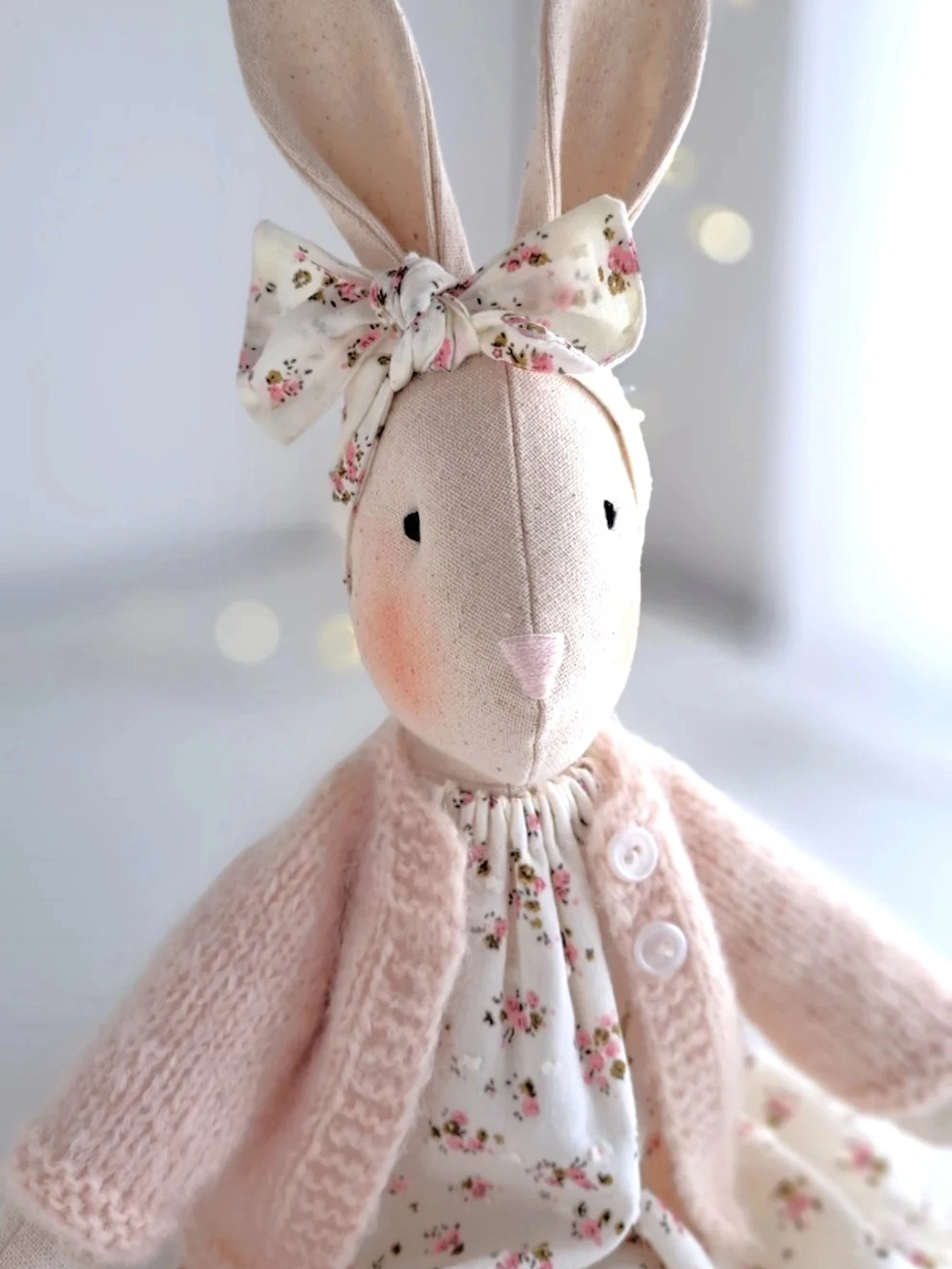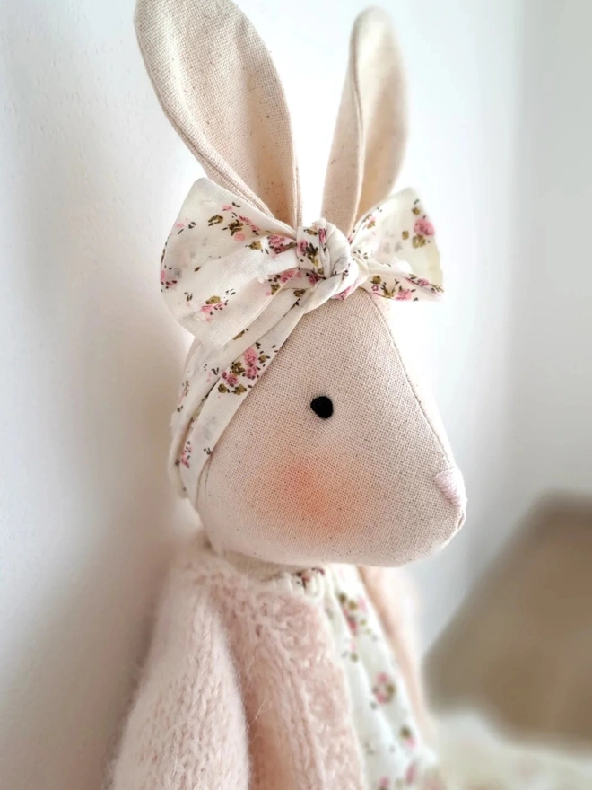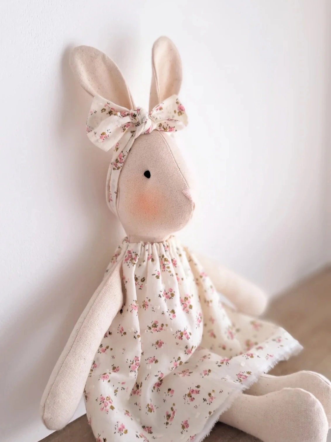 Sweet little Veronica Bunnies are beautiful handmade soft toy rabbits created using natural cotton fabric with hand embroidered eyes and nose. Perfect as a birthday present, baby shower gift, nursery decoration or family heirloom toy.
