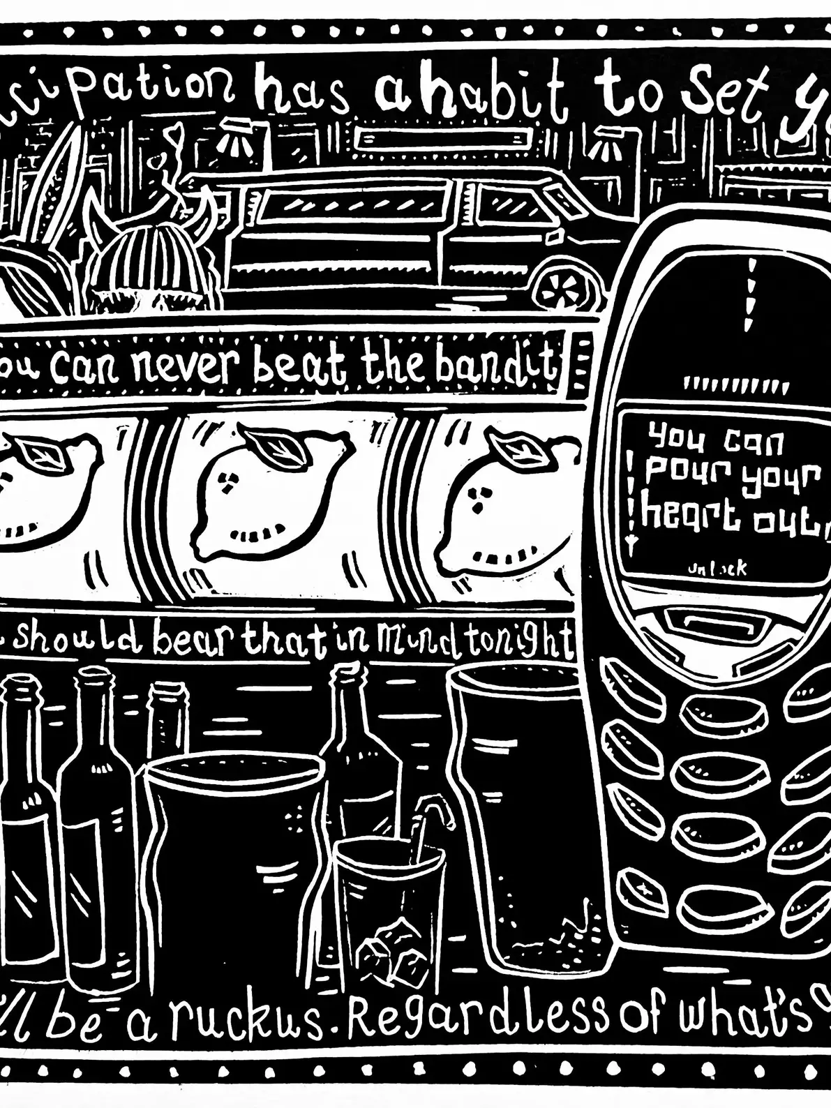 Original linocut print featuring lyrics from the song 'View From The Afternoon' by Arctic Monkeys, from the 2006 album 'Whatever People Say I Am', That's What I'm Not'...