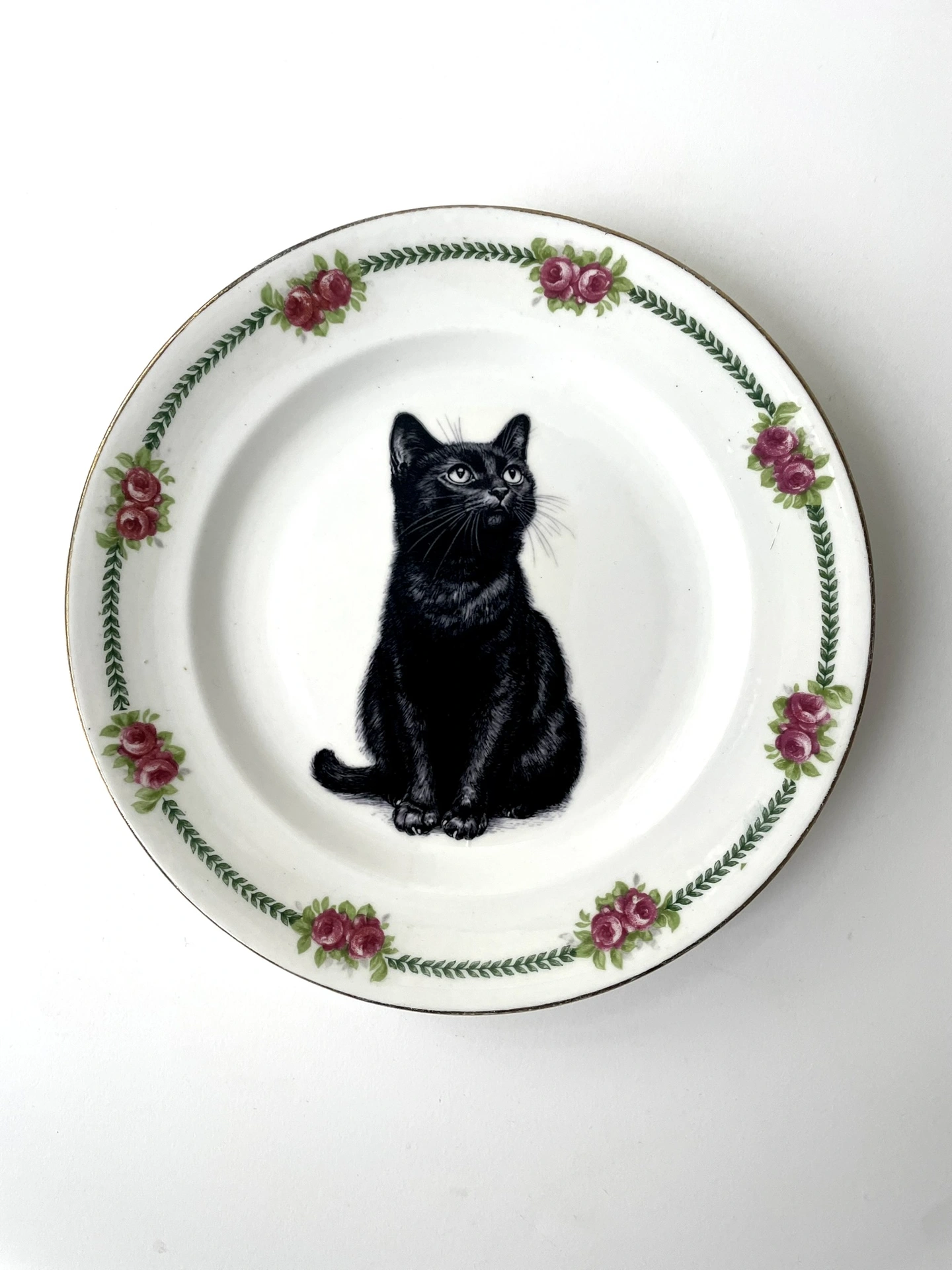 I found a vintage fine bone china plate, and created a vintage image of a black cat, and handmade and placed a decal within the ornate frame of this plate - this is a really cool way to have a little bit of vintage and a little bit of art on your wall :)