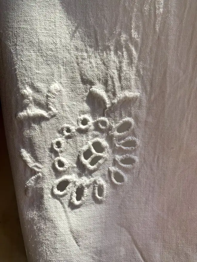 Each one has it's original white-on-white embroidery on one corner and a printed bird illustration diagonally opposite. Repurposing older textiles is a brilliant, sustainable way of having really beautiful things in your home.