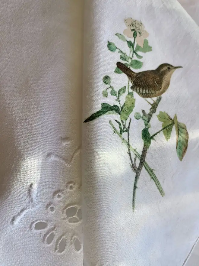 These pristine white cotton napkins have been hand printed with vintage illustrations of garden birds to give them a new lease of life.