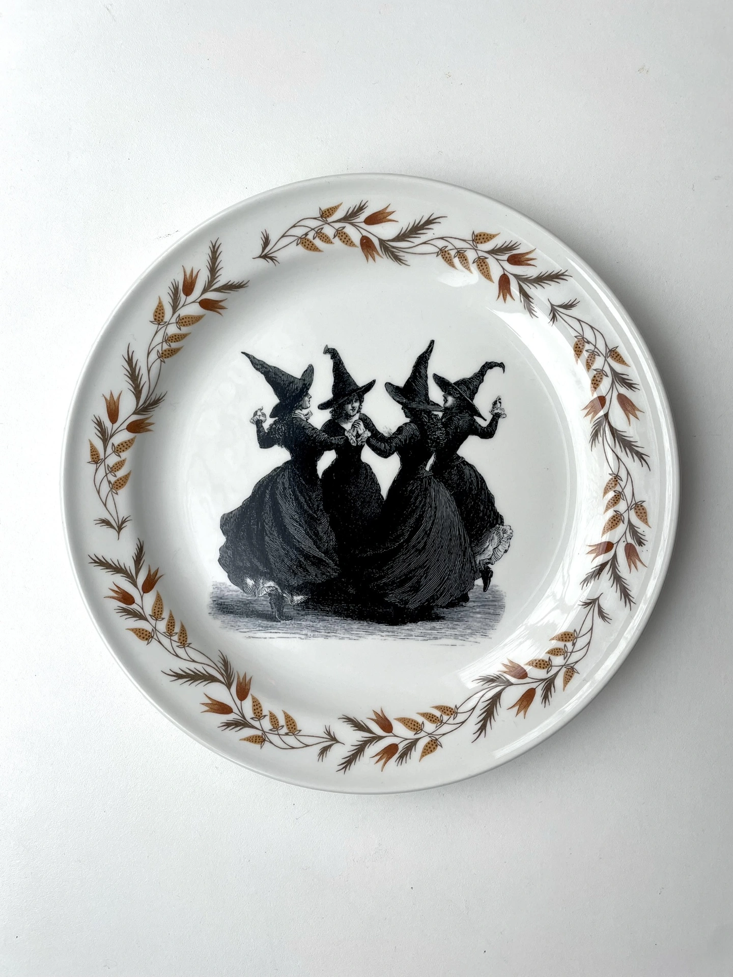 I found a vintage fine bone china plate, and created a coven of witches image, and handmade and placed a decal within the ornate frame of this plate - this is a really cool way to have a little bit of vintage and a little bit of art on your wall :)
