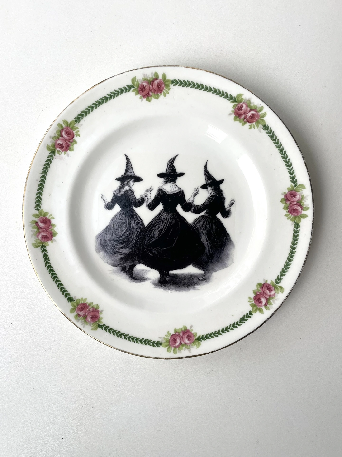 I found a vintage fine bone china plate, and created a coven of witches image, and handmade and placed a decal within the ornate frame of this plate - this is a really cool way to have a little bit of vintage and a little bit of art on your wall :)
