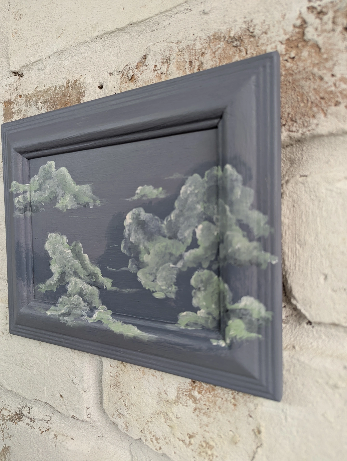 A hand painted vintage frame artwork with a blue/grey colour featuring Raspberry/Plum and mint coloured clouds...