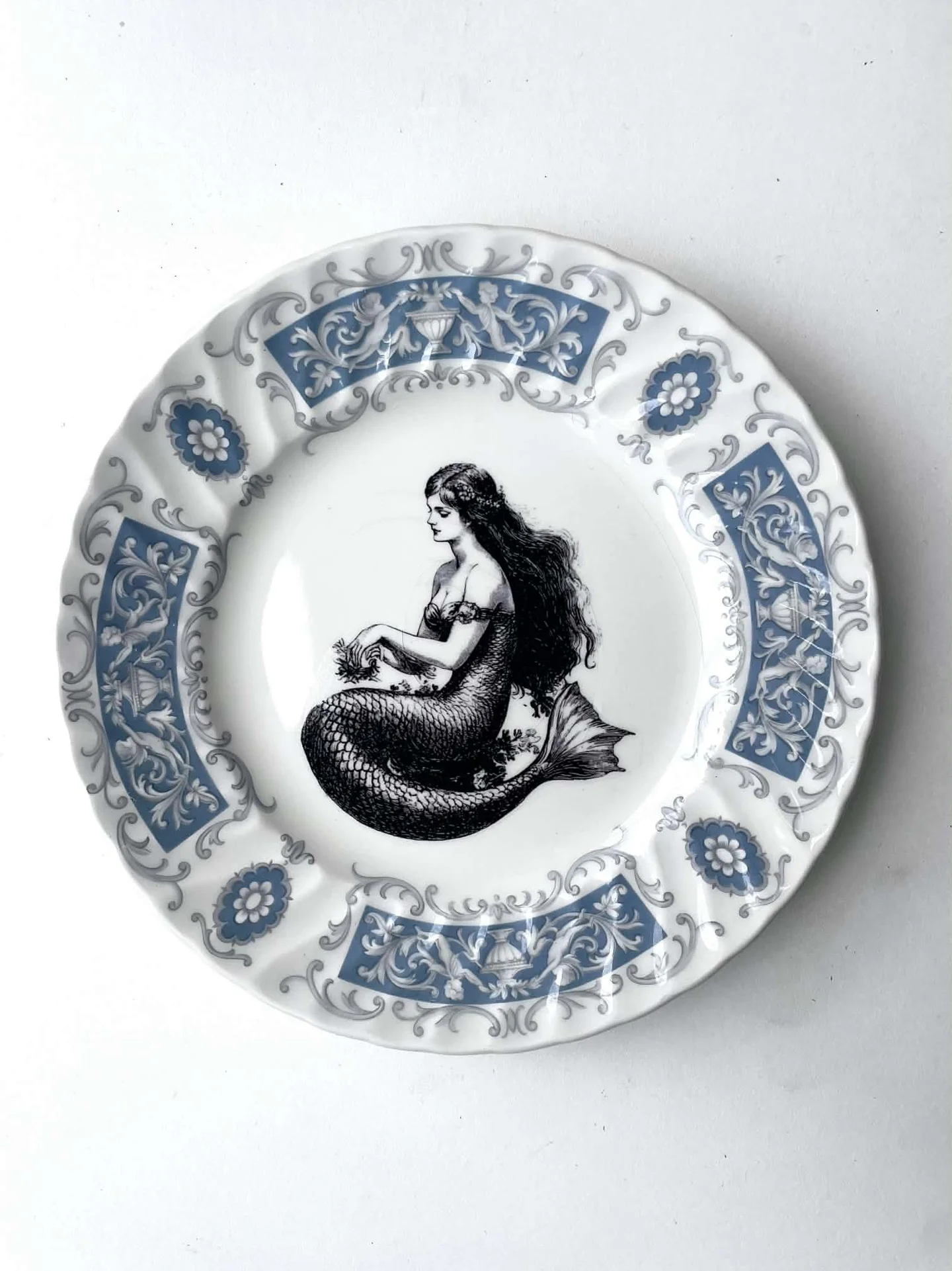 I found a vintage fine bone china plate, and sourced a vintage mermaid image, and handmade and placed a decal within the ornate frame of this plate - this is a really cool way to have a little bit of vintage and a little bit of art on your wall :)