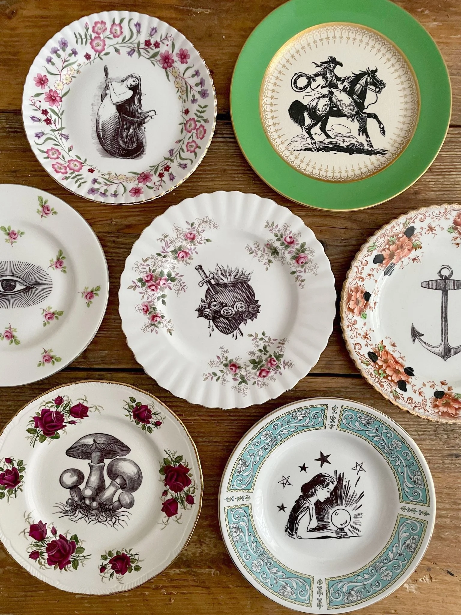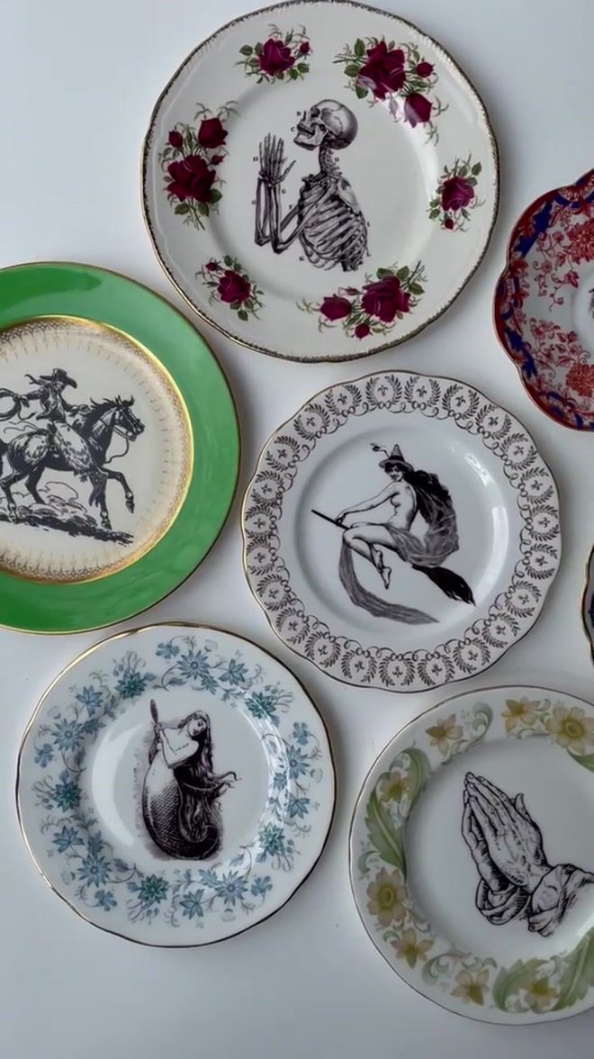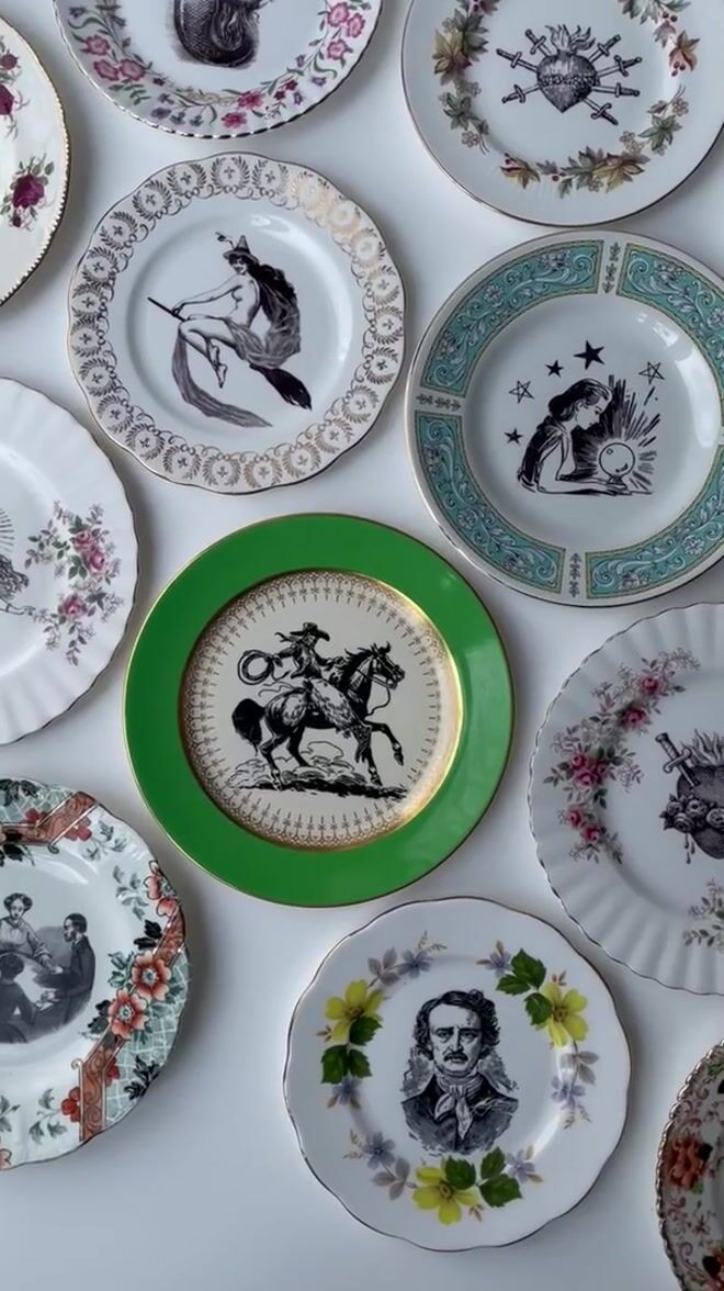 My plate collection is huge so I will never make two the same. This plate/image combination is therefore one of a kind design, and will look great mixed in with other plates and pieces on your wall.