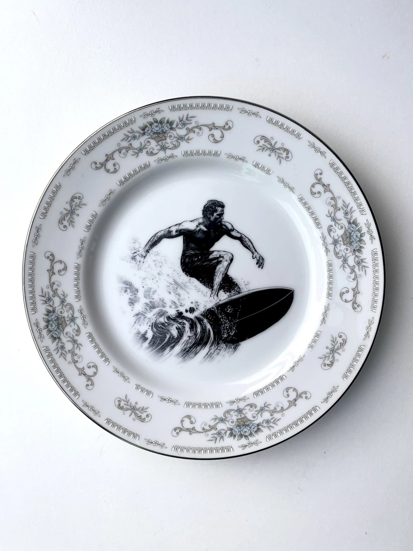 I found a vintage fine bone china plate, and created a vintage style image of a surfer riding a wave, and handmade and placed a decal within the ornate frame of this plate - this is a really cool way to have a little bit of vintage and a little bit of got...