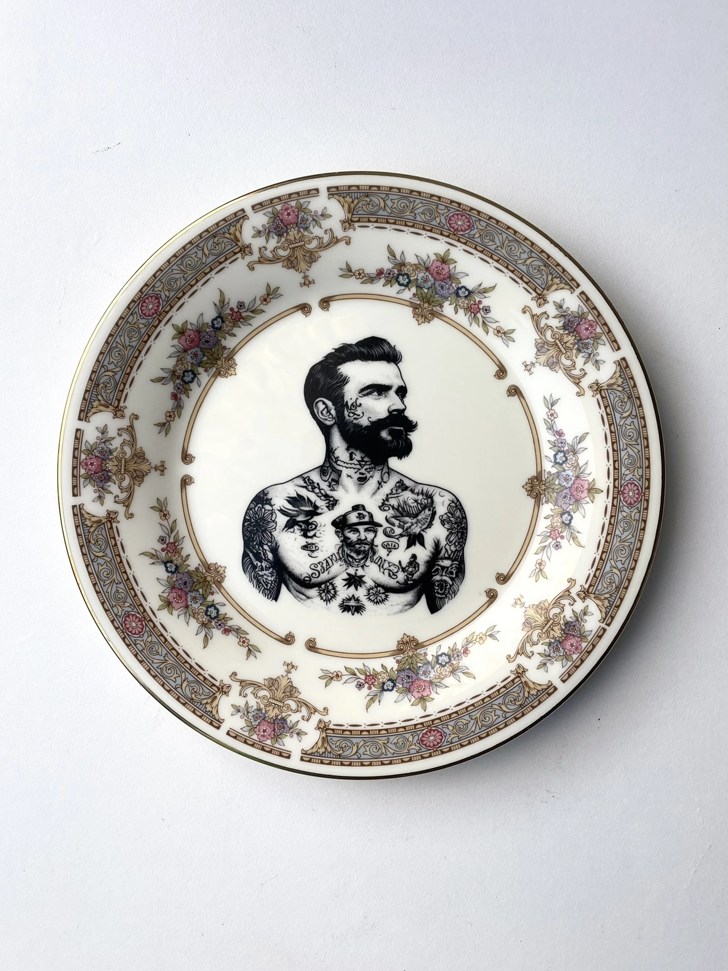 I found a vintage fine bone china plate, and sourced a vintage Tattooed Victorian Man image, and handmade and placed a decal within the ornate frame of this plate - this is a really cool way to have a little bit of vintage and a little bit of gothic art o...