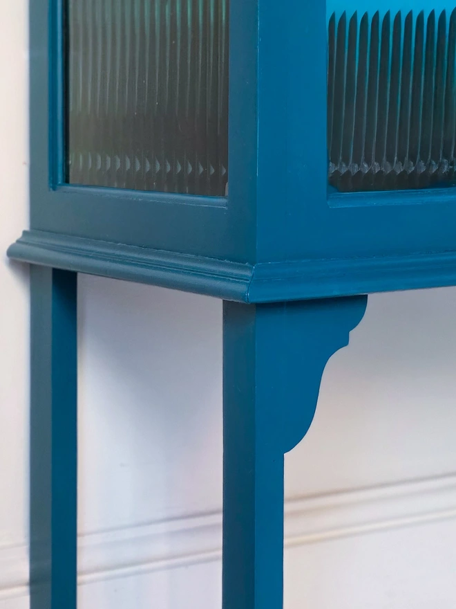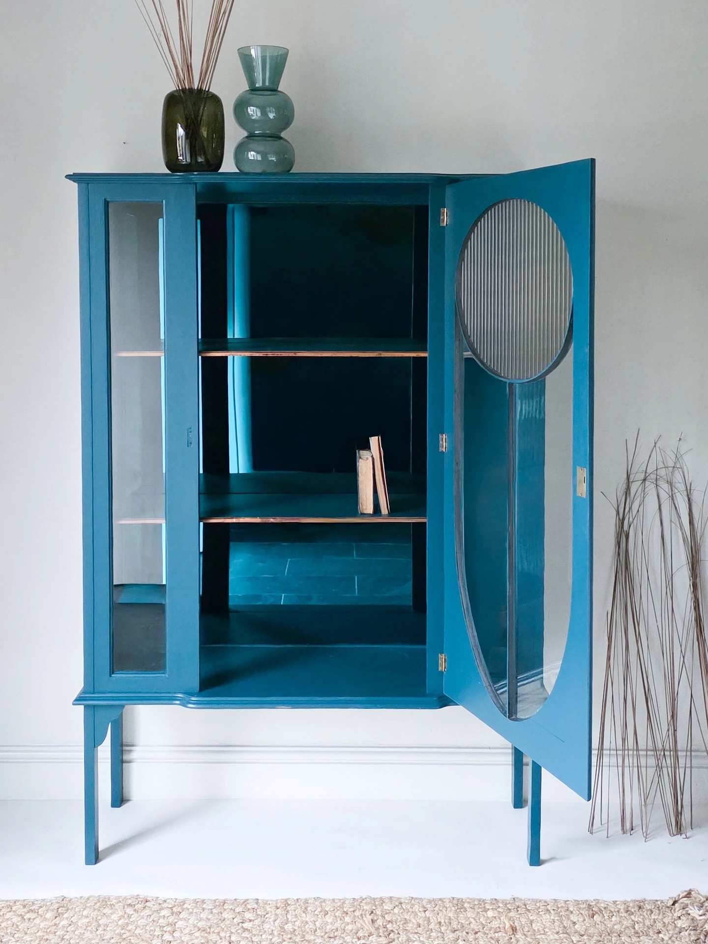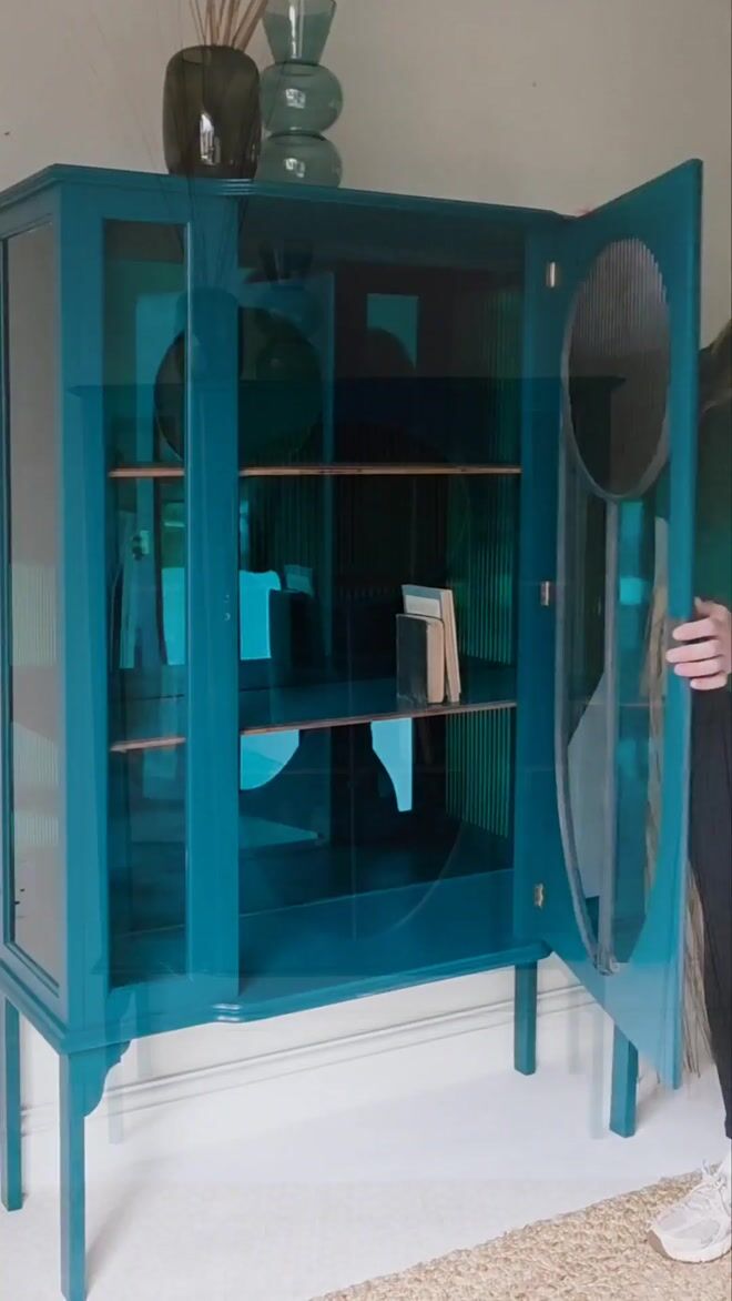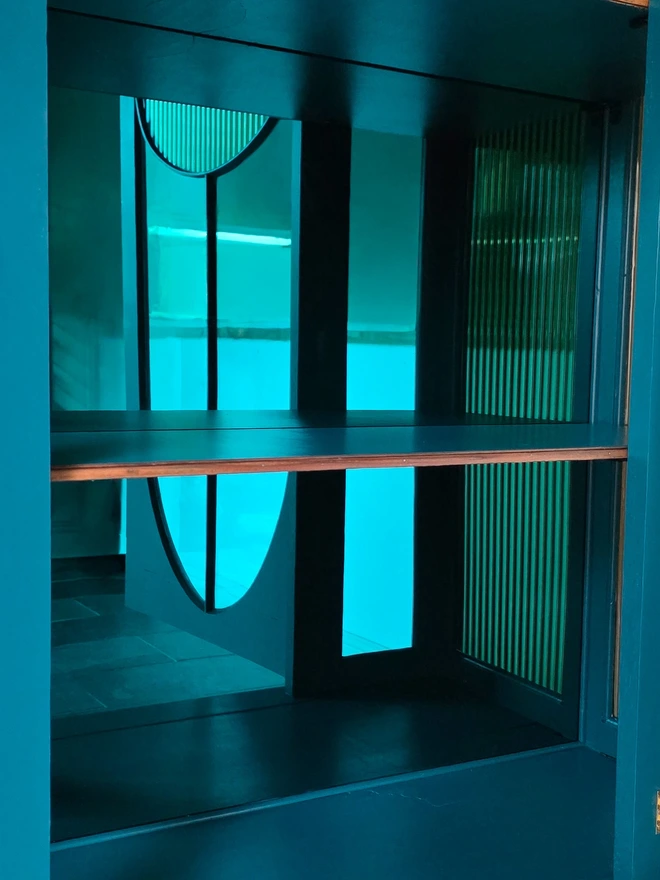 It’s a beautiful piece that makes a real statement, once dated it has now been transformed into a gorgeous drinks or display cabinet; or perhaps a bookcase with a modern design edge yet retaining plenty of vintage character. The glazing has been given a contemporary twist using coffee/ gold coloured vinyl panels, and luxurious teal acrylic mirror on the back panel, set against a colourful and vibrant backdrop.