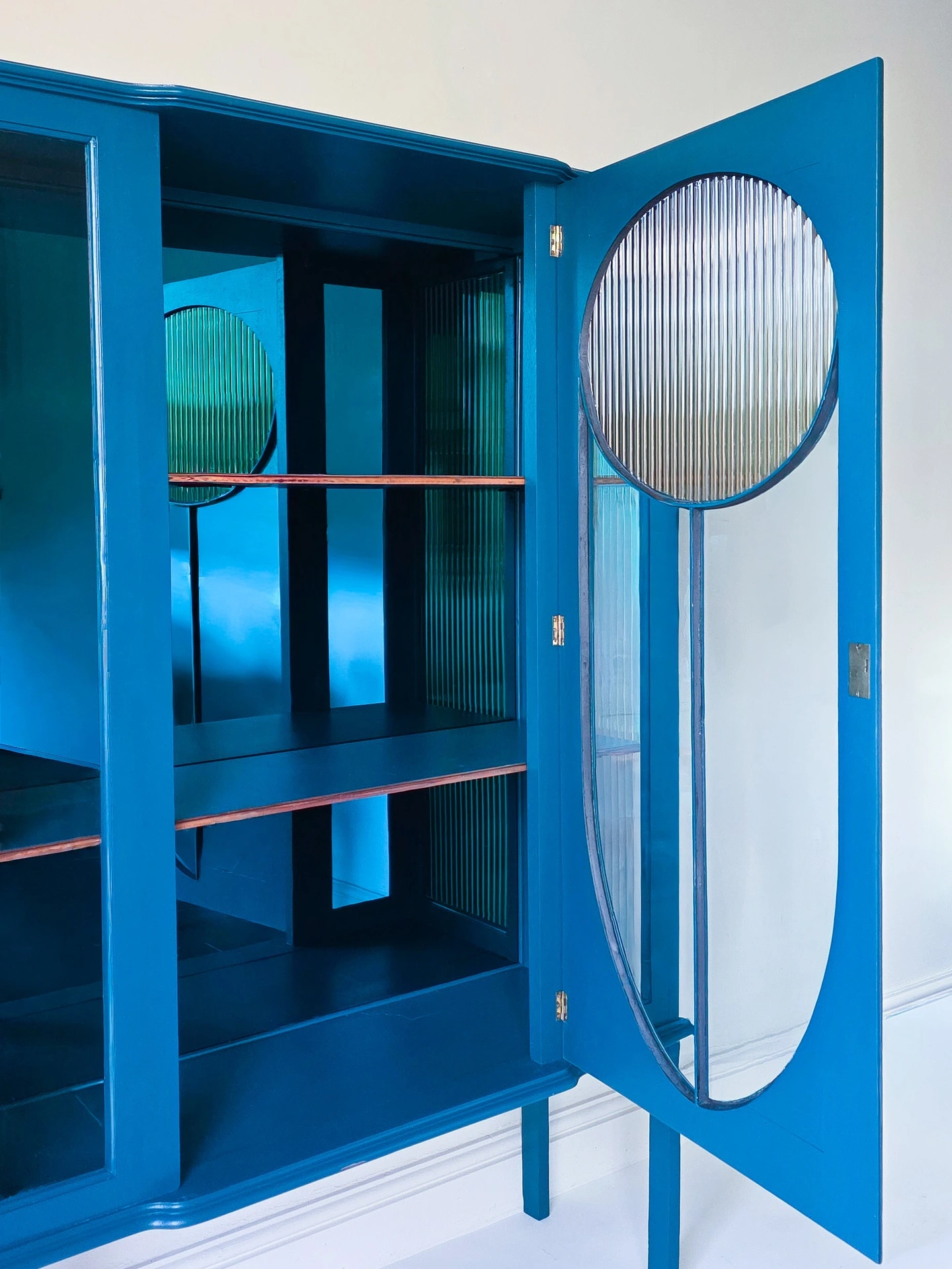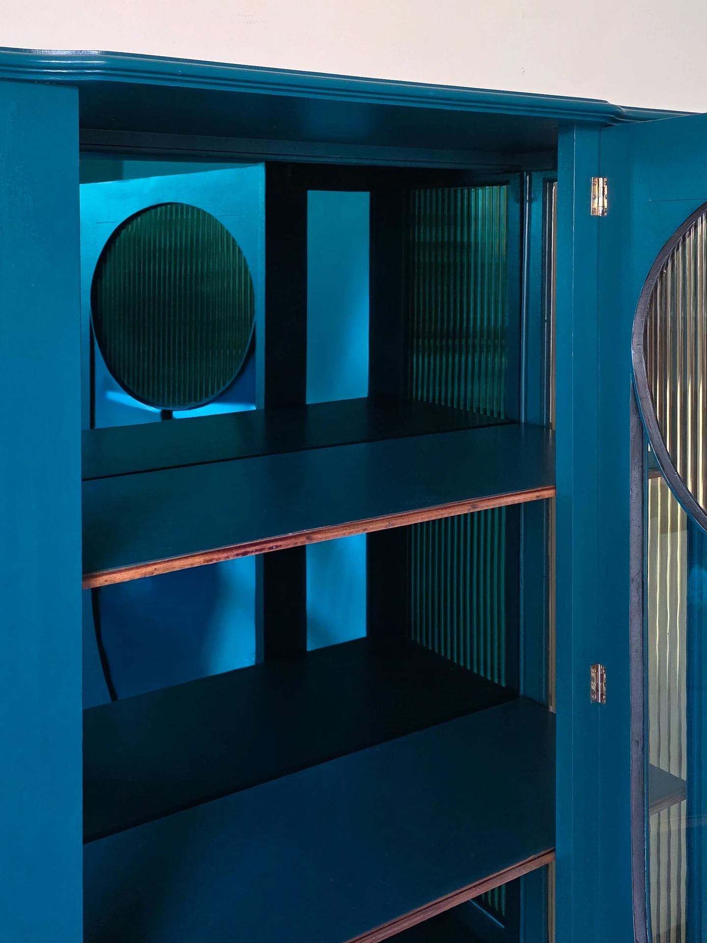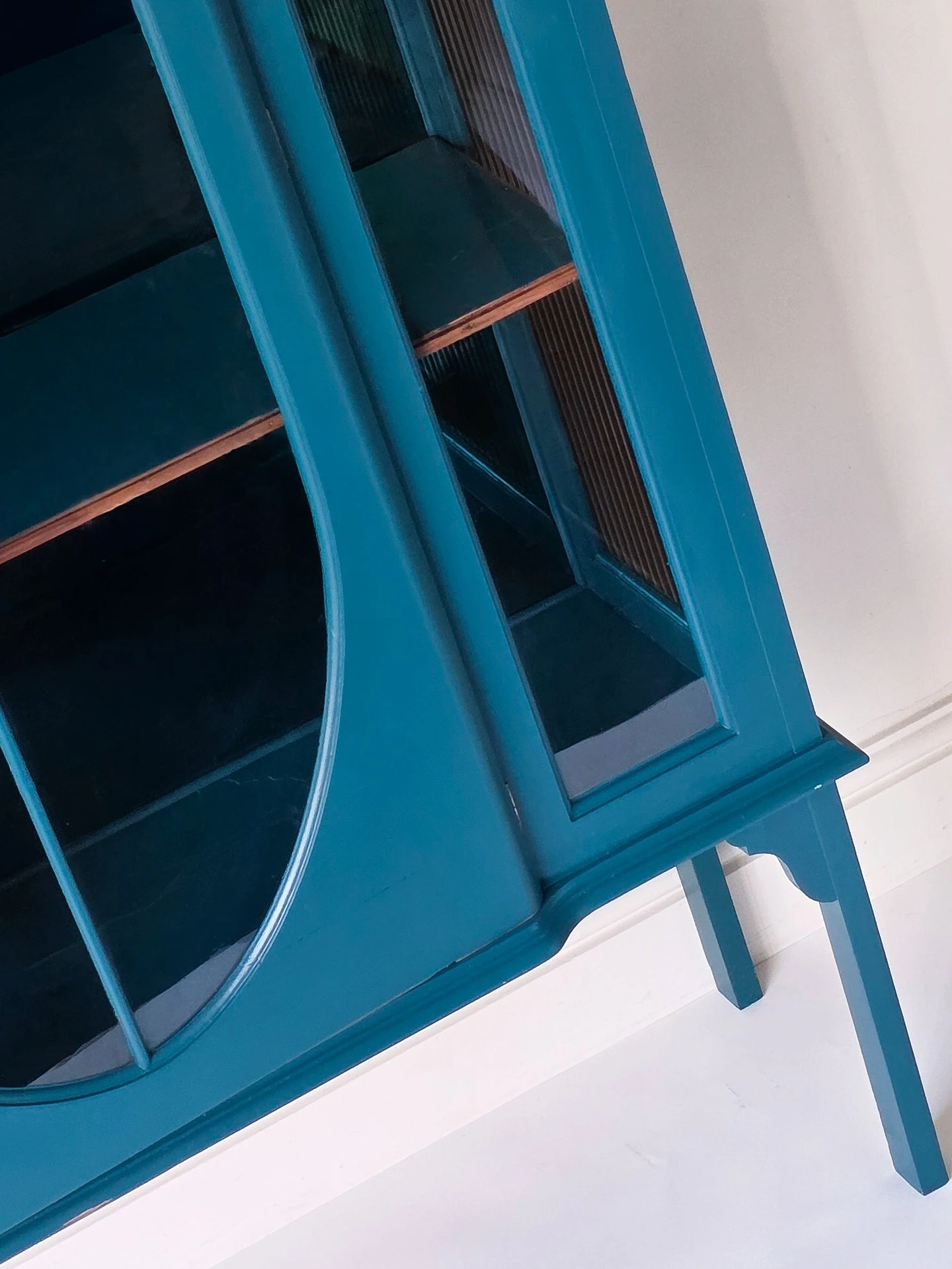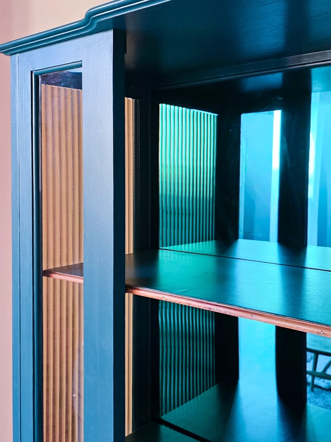 The frame has been painted in teal eggshell which has a slight sheen, the colour is almost identical to the bespoke piece of mirror I have used to create a sophisticated colour drenched look. The shelving inside has been replaced with a more sturdy wood replacement and edged with the original trim to retain some character which I think works really well.