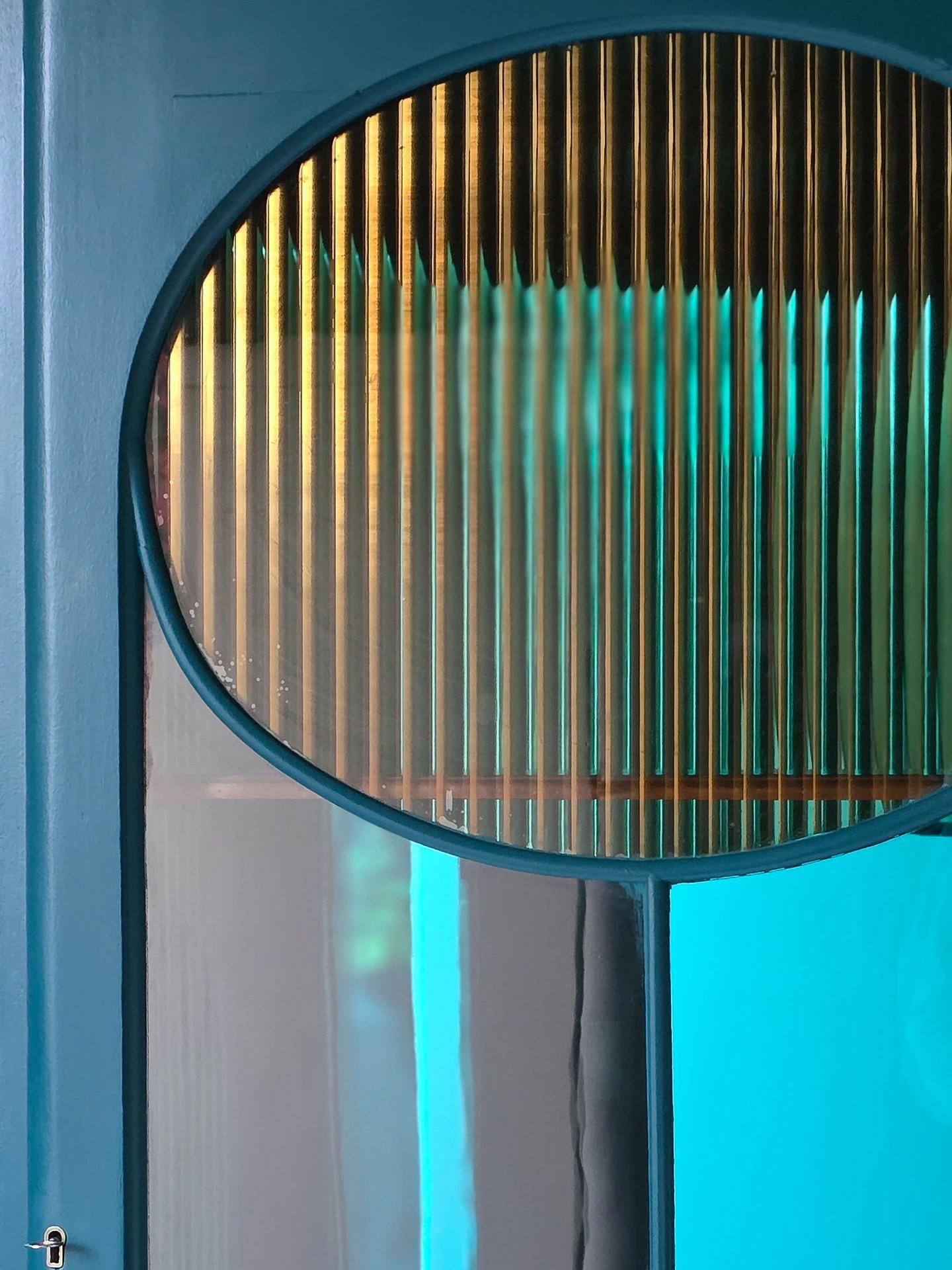 The coloured effect used on the glass reflects differently in different lights, so you will see shades of coffee, bronze, gold and even clear glass throughout the day, which really highlights the stunning arts & crafts inspired oval shapes in the original glass panels.