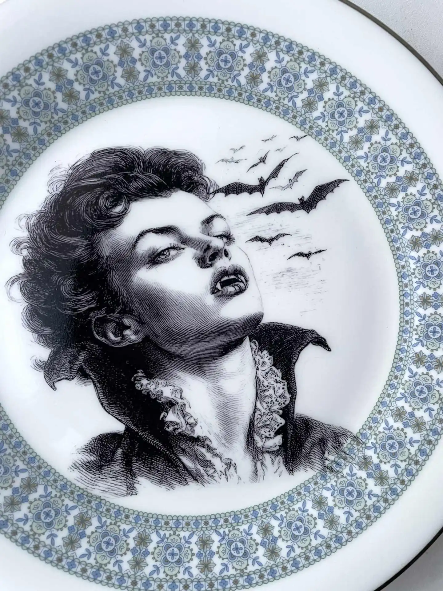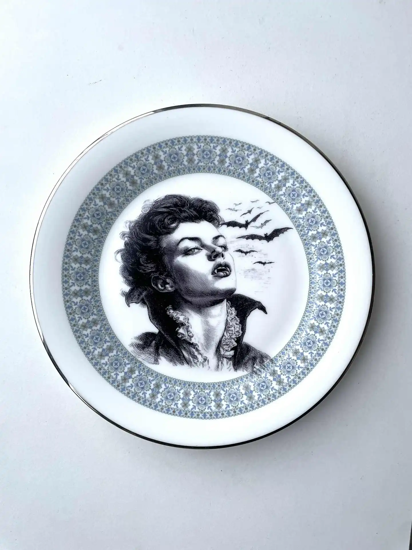 I found a vintage fine bone china plate, and created a vintage image of my interpretation of the vampire Lestat, and handmade and placed a decal within the ornate frame of this plate - this is a really cool way to have a little bit of vintage and a little...