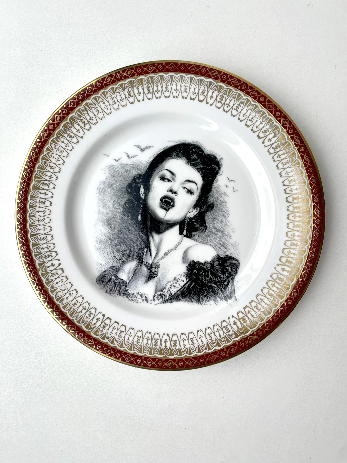 I found a vintage fine bone china plate, and created a vintage image of a Victorian vampire, and handmade and placed a decal within the ornate frame of this plate - this is a really cool way to have a little bit of vintage and a little bit of art on your...