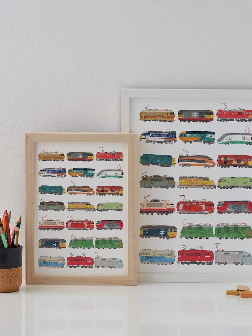 A colourful and detailed print for young train lovers or trainspotters! Featuring an array of 20 familiar and less known British, European, American and Asian vintage trains from the latter half of the 20th century quirkily and vibrantly illustrated.