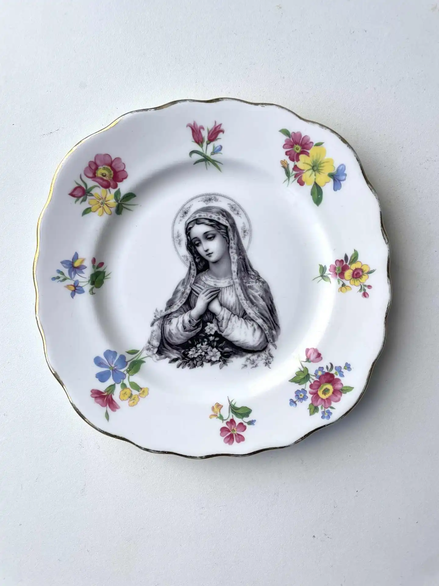 I found a vintage fine bone china plate, and sourced a vintage praying hands image, and handmade and placed a decal within the ornate frame of this plate - this is a really cool way to have a little bit of vintage and a little bit of art on your wall :) beautiful religious imagery with a tattoo art twist