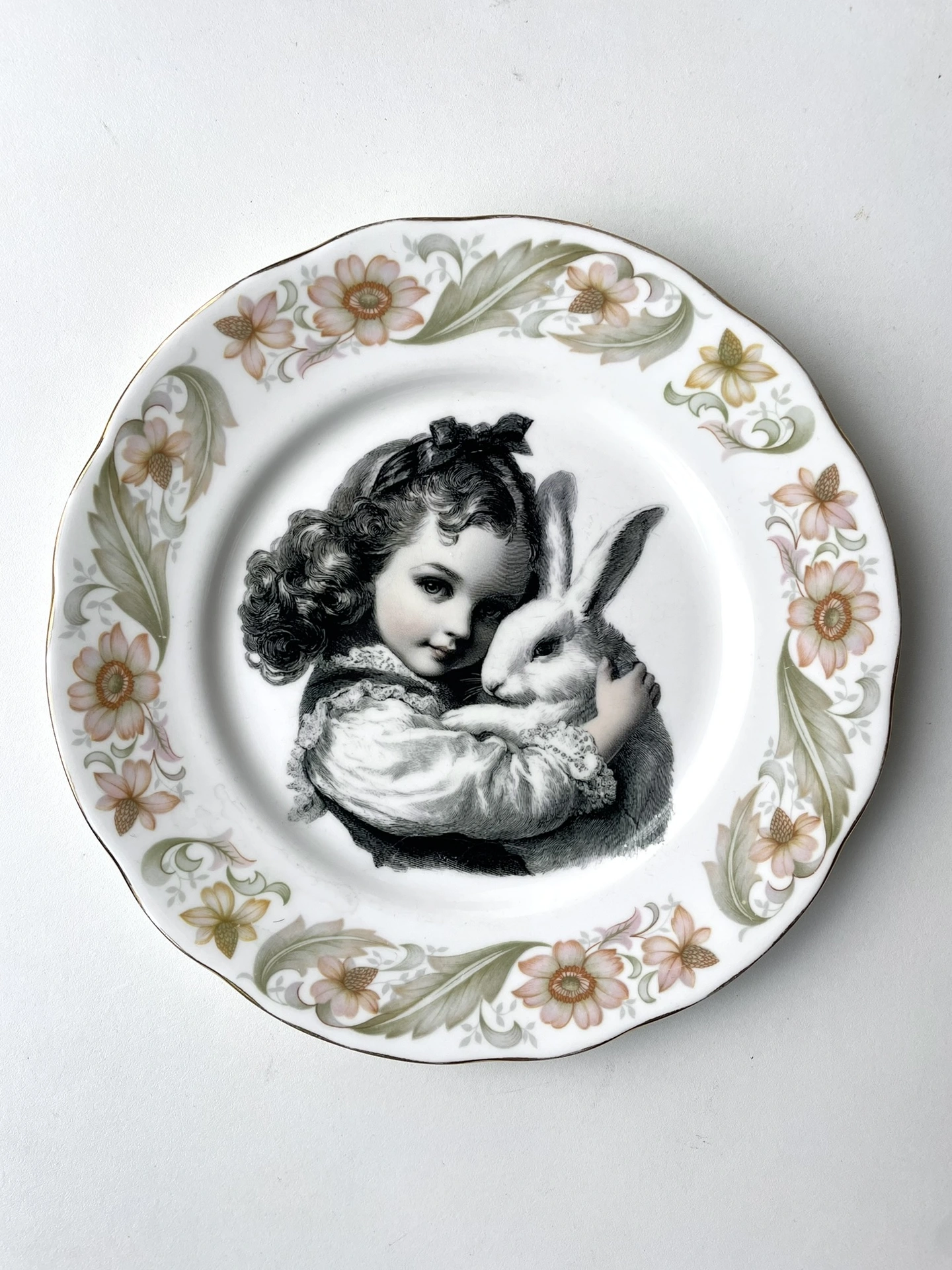 I found a vintage fine bone china plate, and sourced a vintage girl and white Easter Bunny image, and handmade and placed a decal within the ornate frame of this plate - this is a really cool way to have a little bit of vintage and a little bit of gothic...