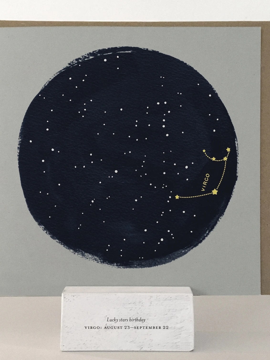 This zodiac birthday card with the Virgo constellation of stars is the perfect card for every one with this star sign born between August 23–Sept 22
