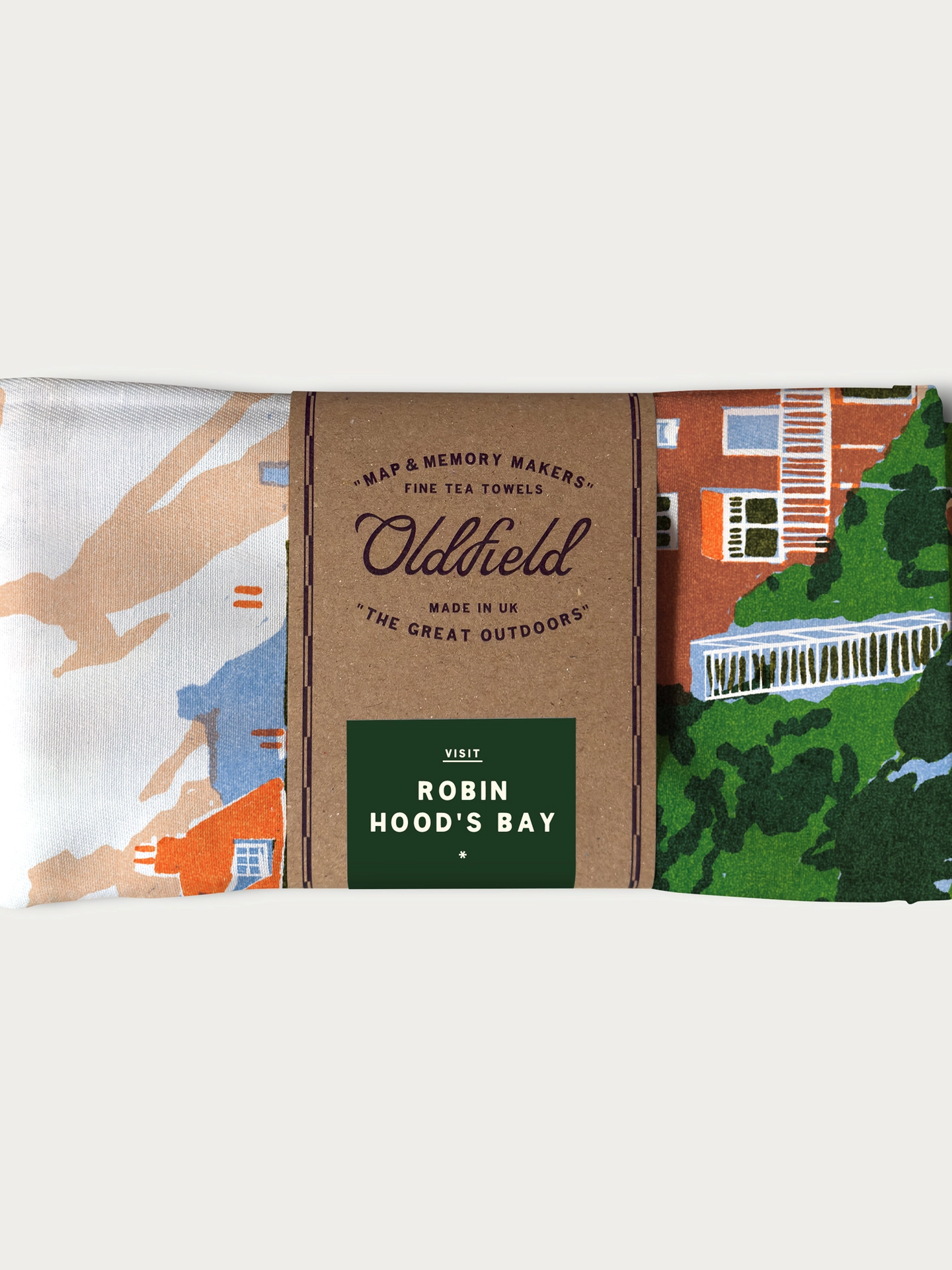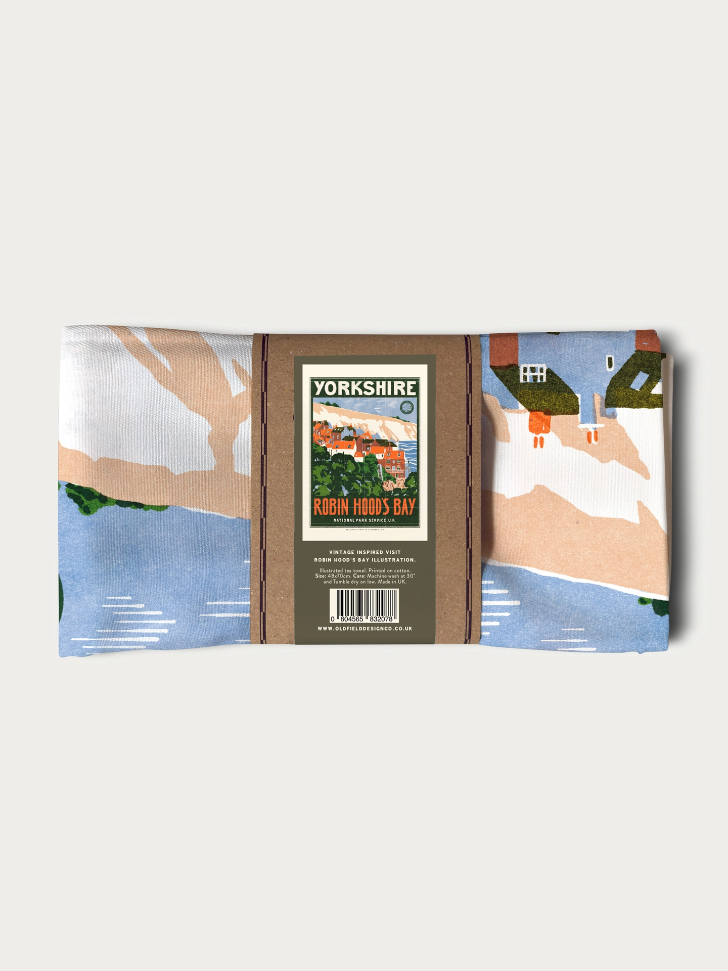 Retro artwork in the style of a vintage railway poster printed in the UK on a high quality, thick, cotton canvas, tea towel. Whether they are used at home or on adventures out in the camper van it makes the perfect, practical gift for a fan of Robin Hood's Bay and the surrounding area.