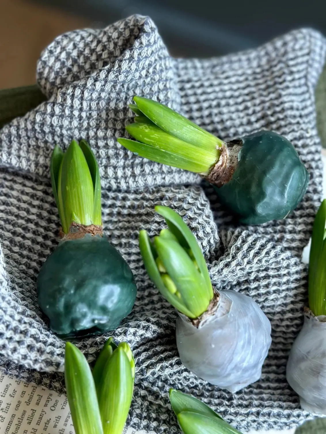 Waxed hyacinths dipped in wax in a set of three are a beautiful, unique decoration that can bring an elegant spring feel to any home. These flowering bulbs are protected with wax to keep the moisture inside and allow the bulb to sprout and bloom by itself. All the energy and water that the plant needs is stored in the bulb, so there is no need for planting or watering.