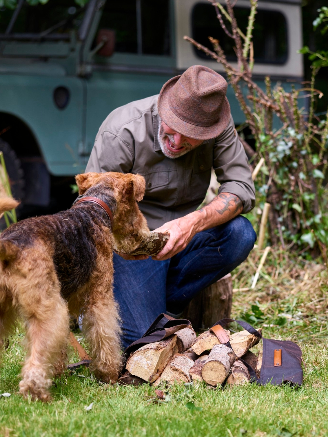A tough and hardwearing waxed cotton log carrier sewn by hand with extra wide, strong straps and a hidden pocket for your axe...