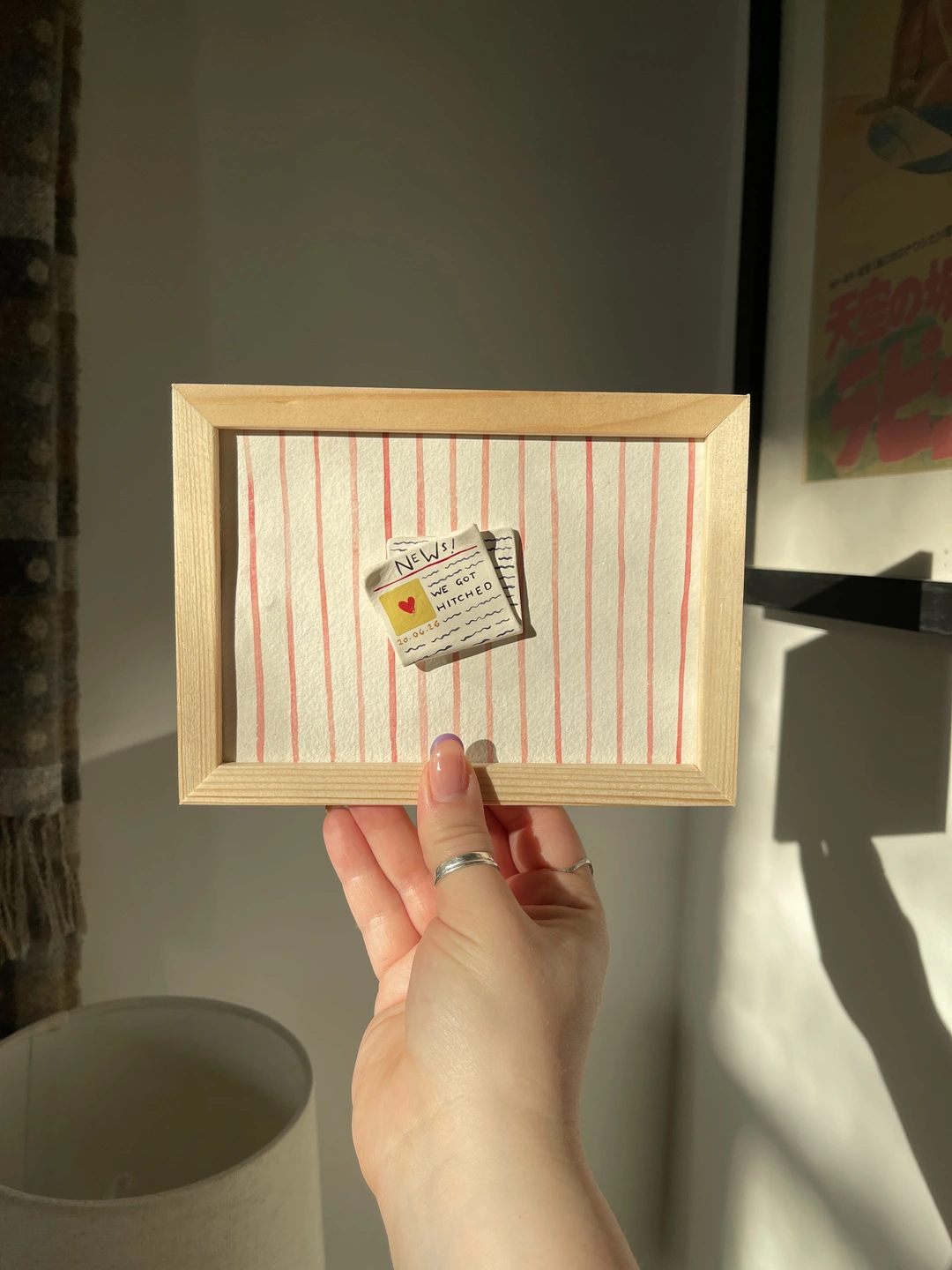 Frame is included, each newspaper is crafted and painted by hand - the whole piece will then be mounted onto handmade paper and secured within the frame