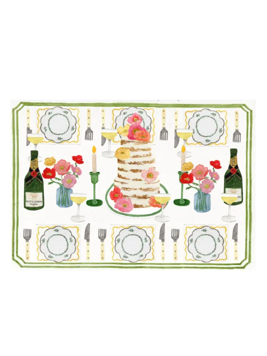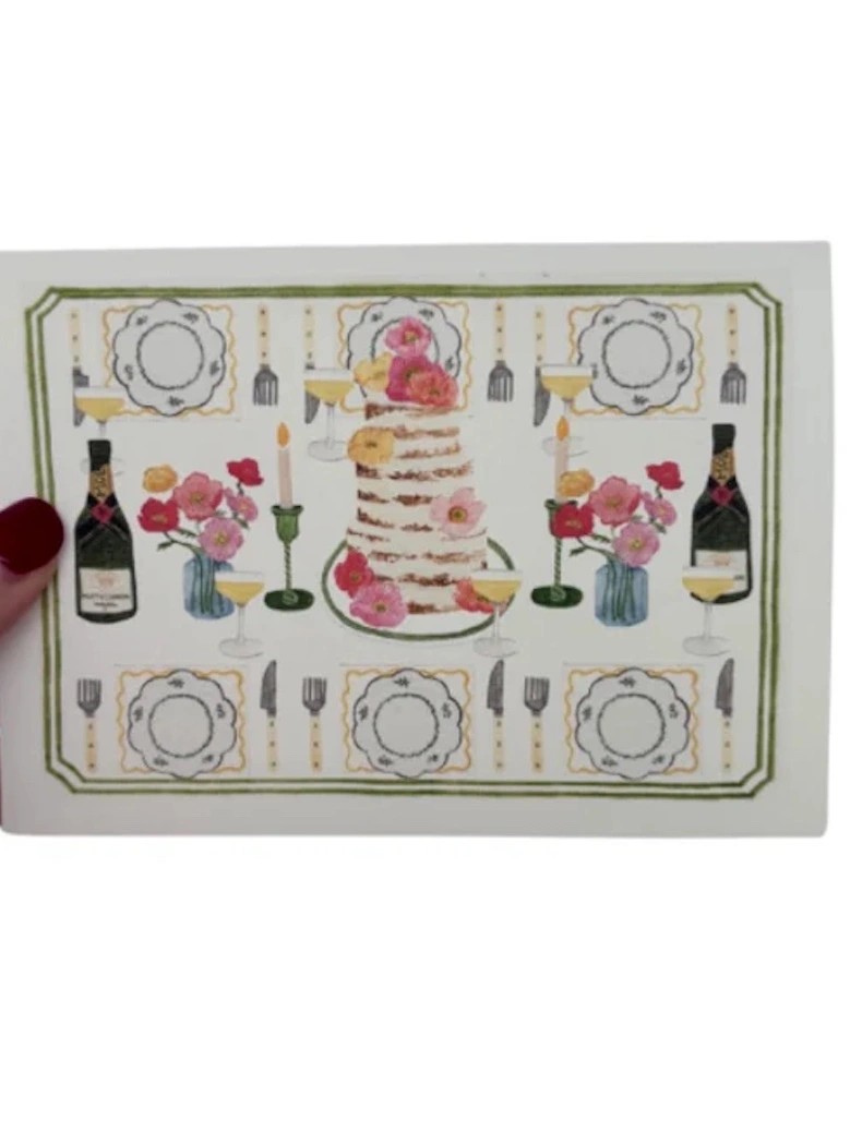 Printed card of an original hand illustrated collage of a wedding table scene. Perfect for engagements or to accompany a wedding present or thanking the hosts.