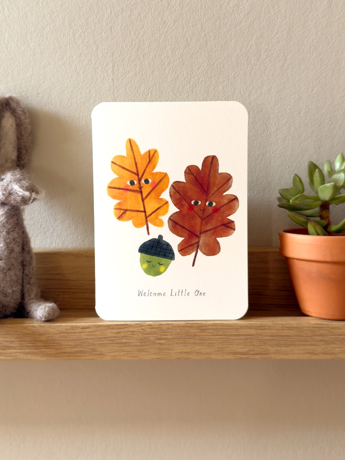 Illustrated greeting card of two oak leaves and an acorn with the wording 'Welcome Little One'. The perfect card to celebrate the arrival of a new baby.