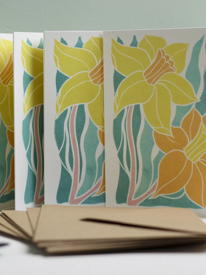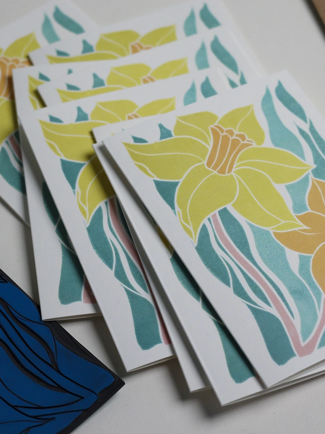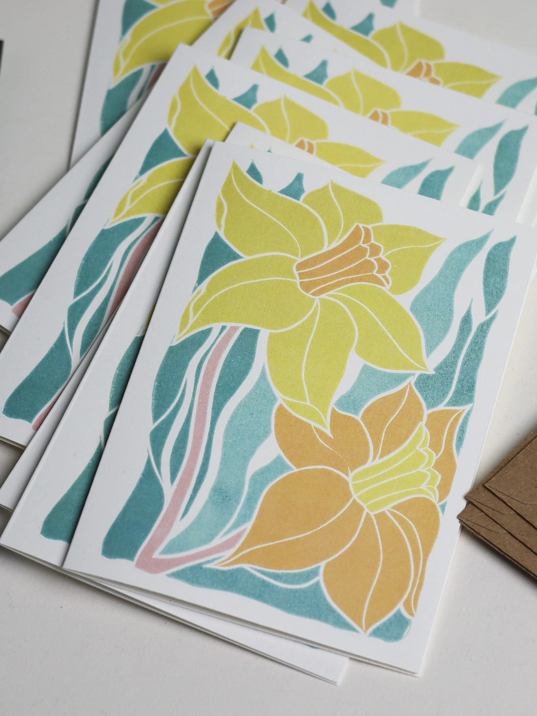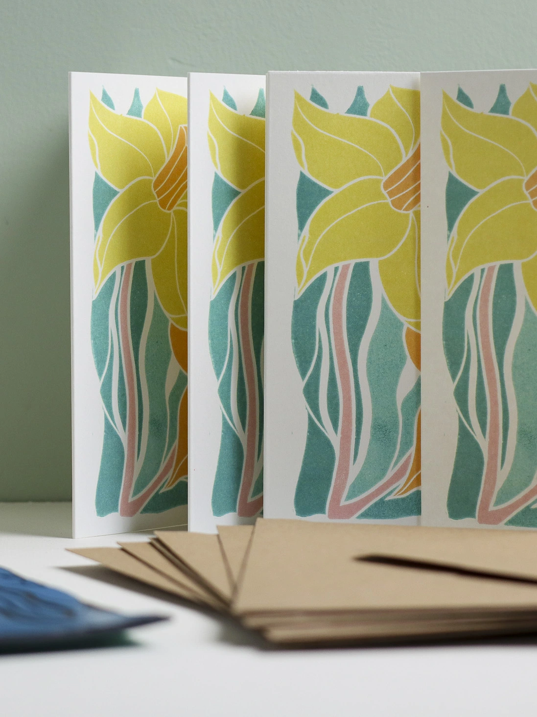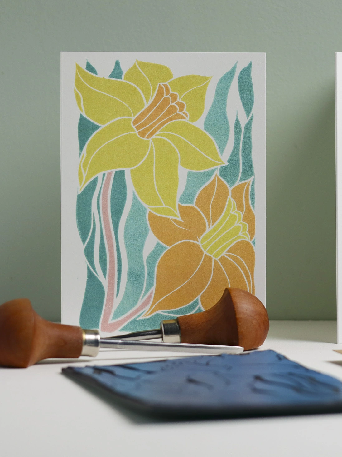 A luminous celebration of Wales' national flower, hand-carved in my Norfolk studio. Bold yellow petals and delicate corona against sword-like leaves in soft teals and corals. Each detail meticulously carved by hand into linoleum, then brought to life with gentle spring colours. Perfect for St David's Day, spring celebrations, or brightening someone's day with floral sunshine.
