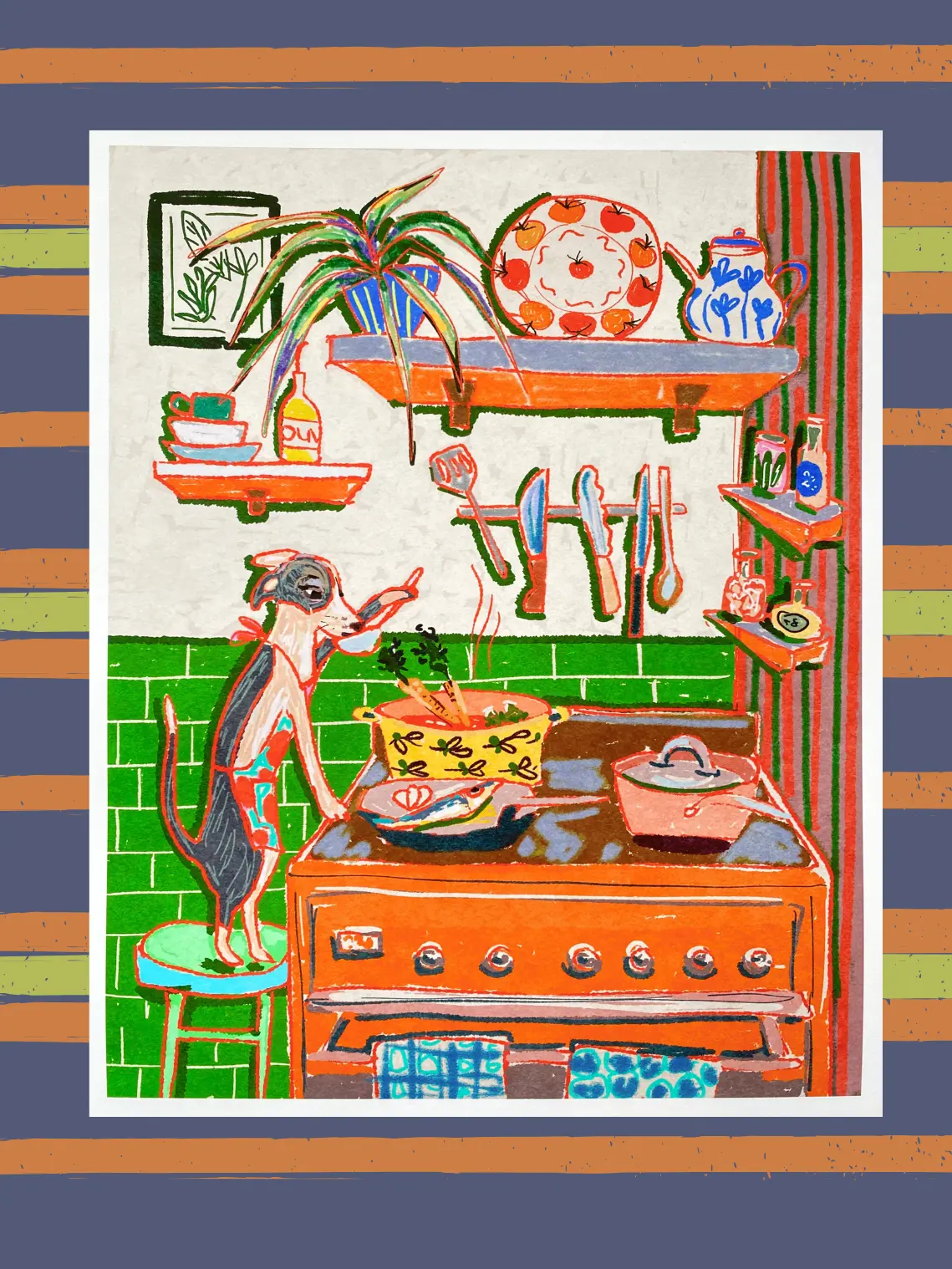 This charming print is perfect for adding a touch of playful personality to any kitchen, dining room, or child's bedroom. It's also a wonderful gift for dog lovers and anyone who appreciates a bit of whimsy in their home decor. Perfect for dog lovers and food enthusiasts alike, this whimsical piece is sure to bring a smile to your face. A delightful addition to your kitchen or dining room decor.