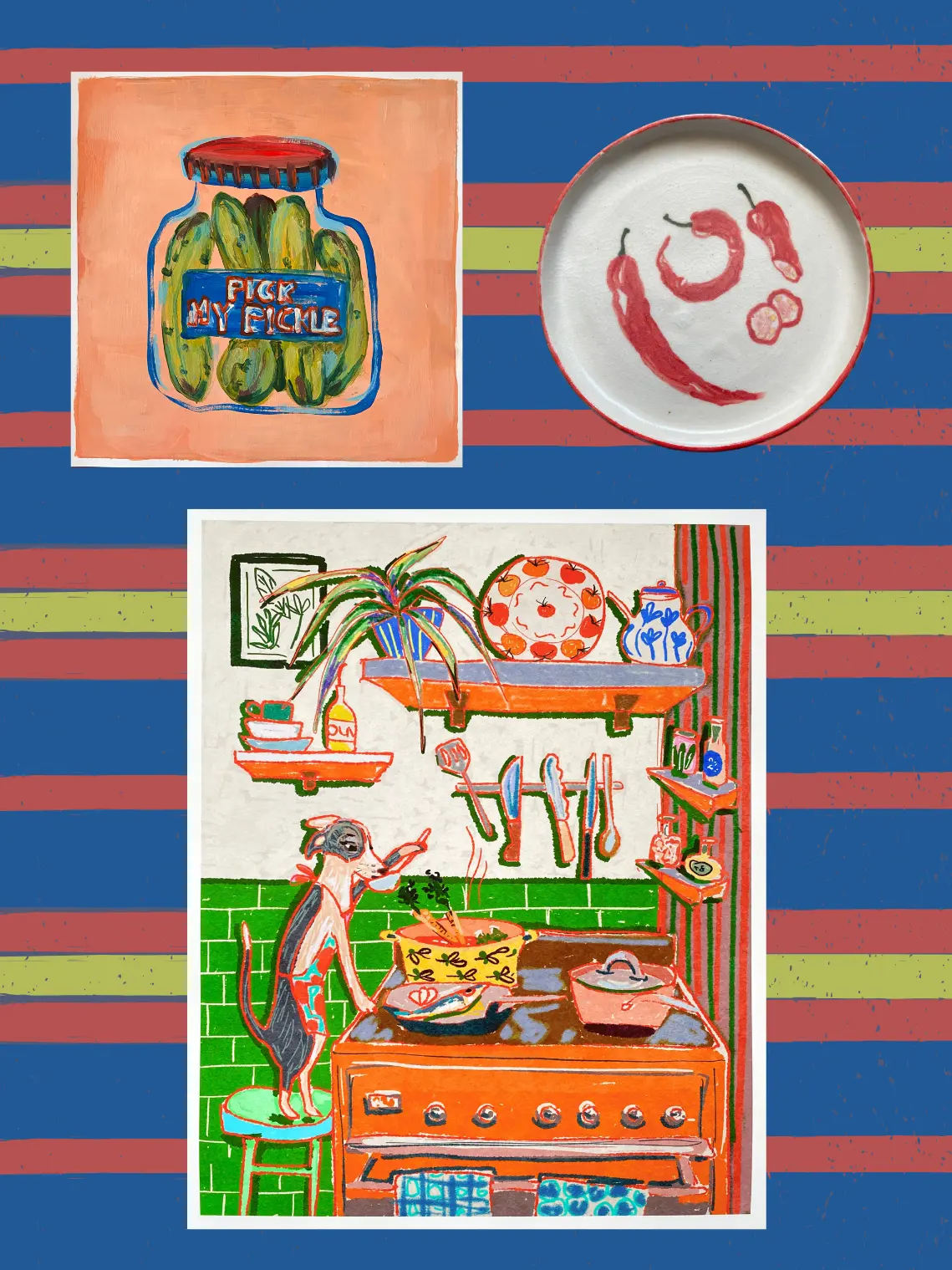 Add a touch of culinary delight to your walls with this charming Mar Wanda Chef Kiss art print. This adorable art print features a whimsical illustration of a cute puppy chef hard at work in a retro kitchen. He's whipping up a delicious meal, and we can almost smell the delicious aromas!