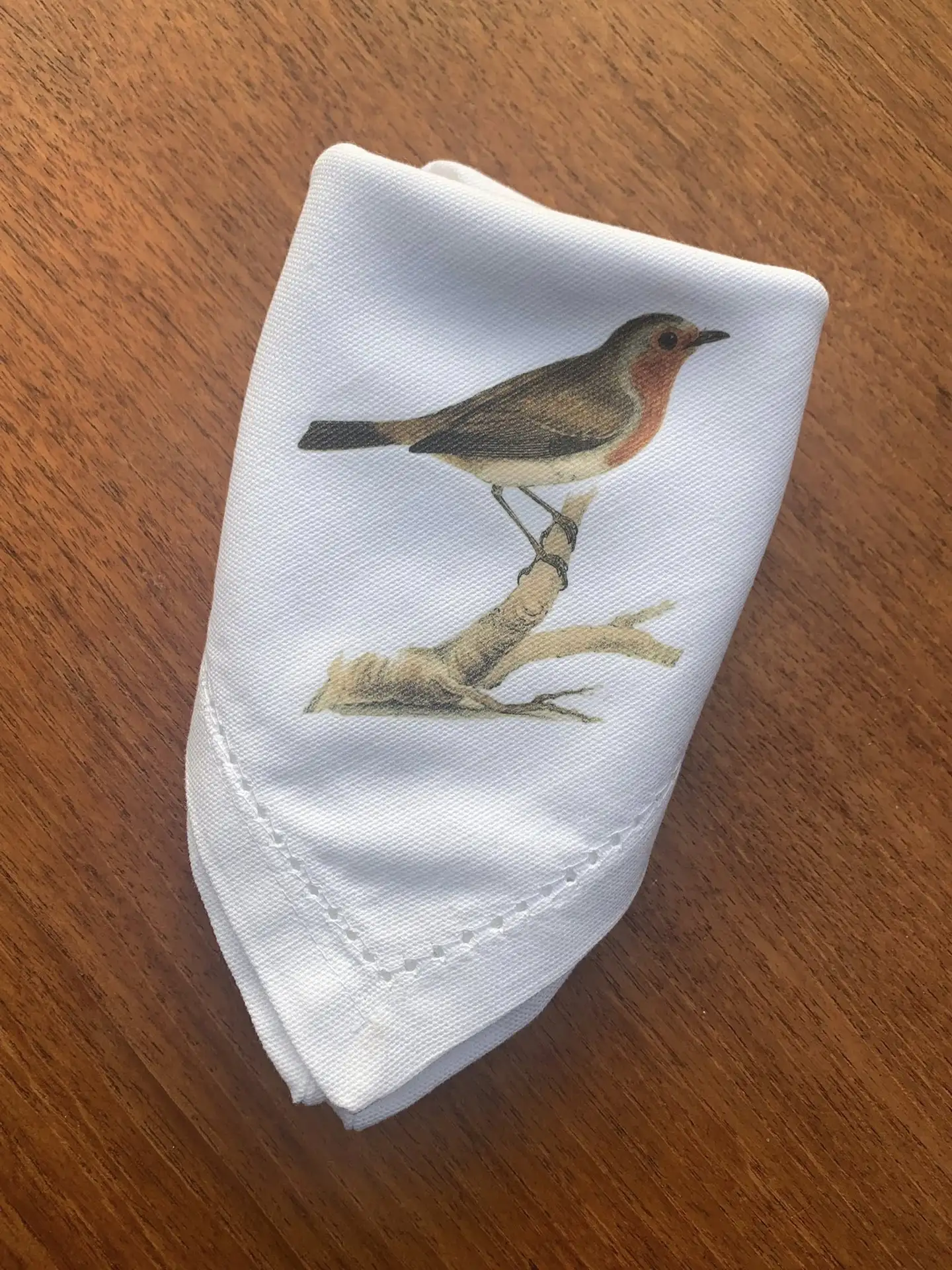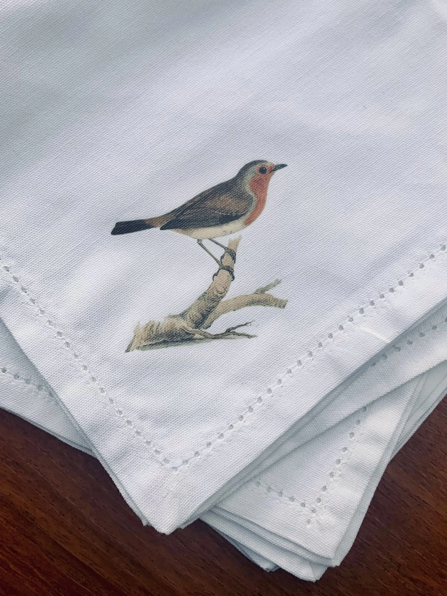 A lovely set of four napkins, made from a heavy, pure white cotton fabric and printed with birds...