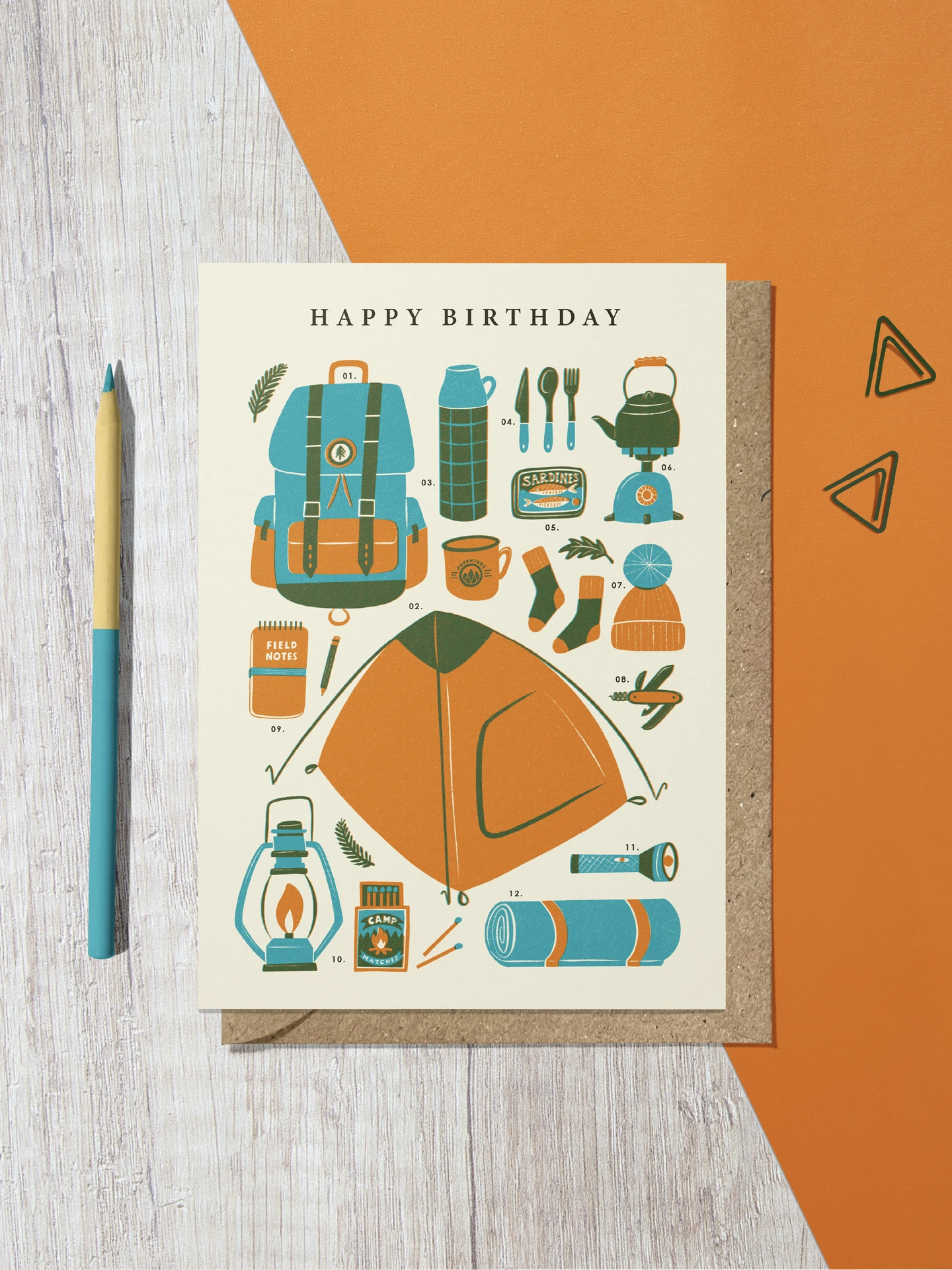 A colourful risograph-style Birthday card series capturing all the essentials for popular outdoor activities and sports. Each card also has a little annotated kit list on the back.