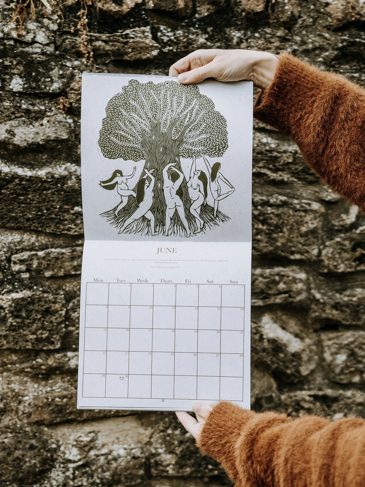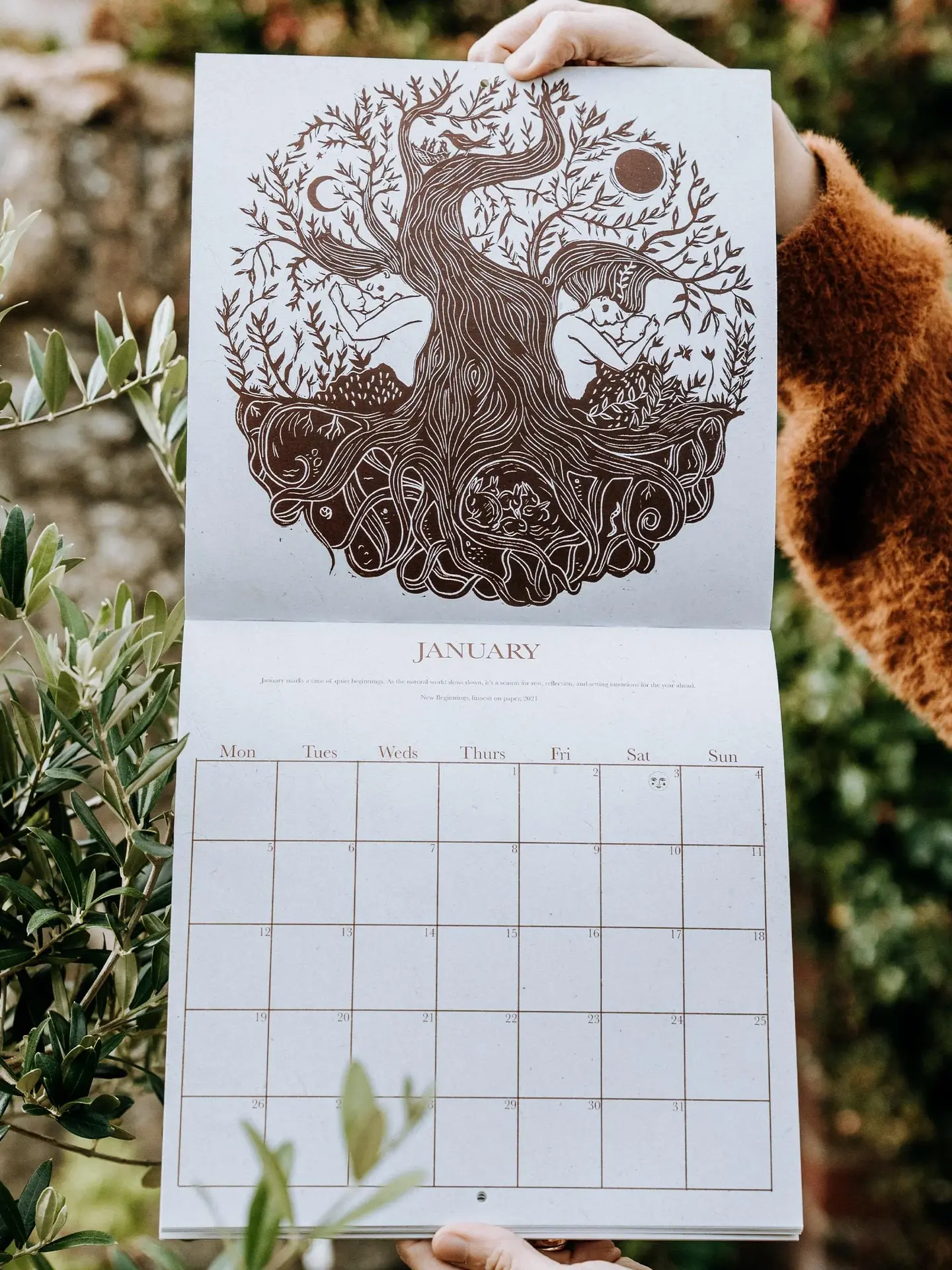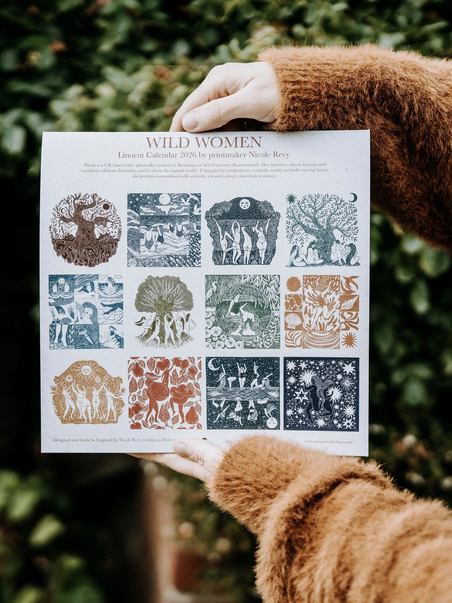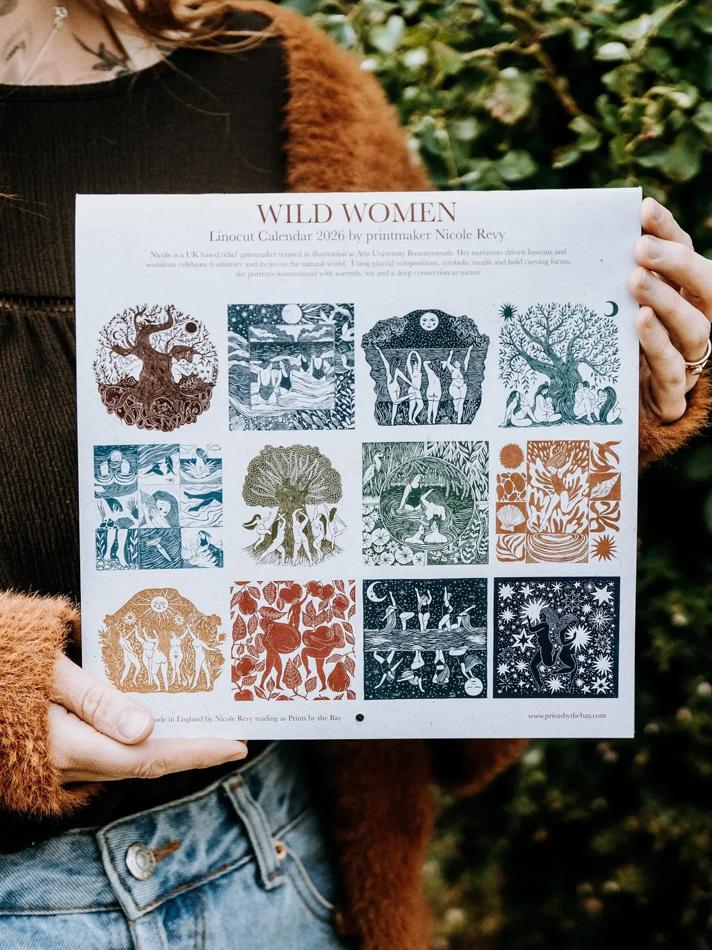 Each full page contains one of Nicole's original linocut prints in full colour, plus a monthly grid format calendar with plenty of space to note all your appointments. The Full Moon has been recorded each month using one of Nicole's whimsical illustrations.