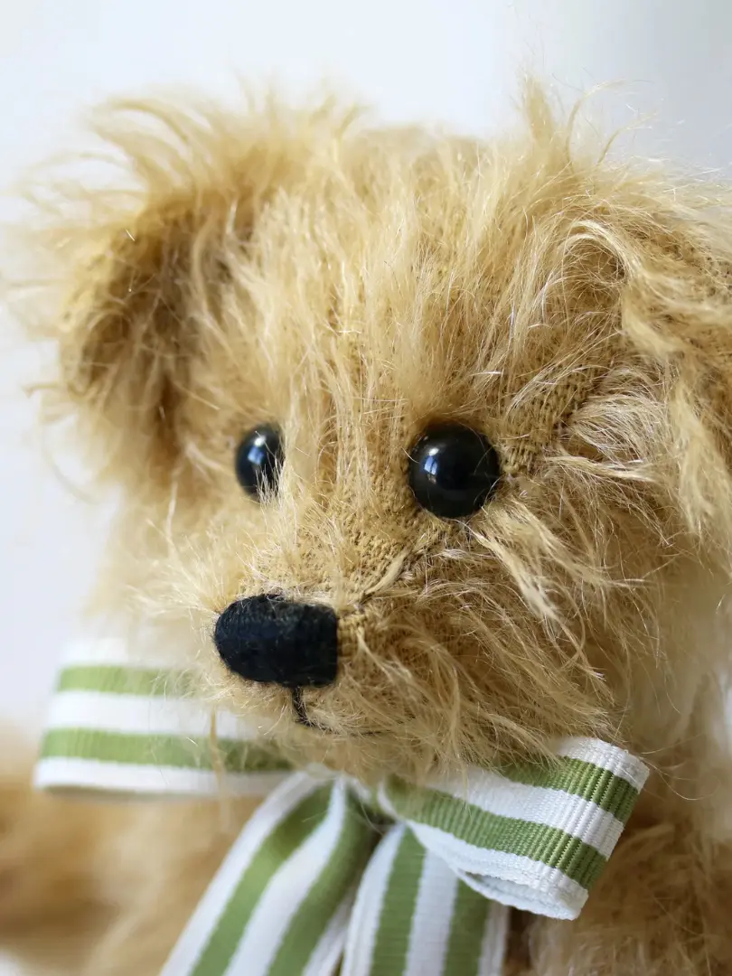 Meet Wilfred, an endearing little chap created from a sparse, antique gold mohair. He has shiny black safety-locking eyes complimented by a hand-embroidered, black yarn nose. To contrast against his unkempt fur, Wilfred’s pads and paws are made out of a f...