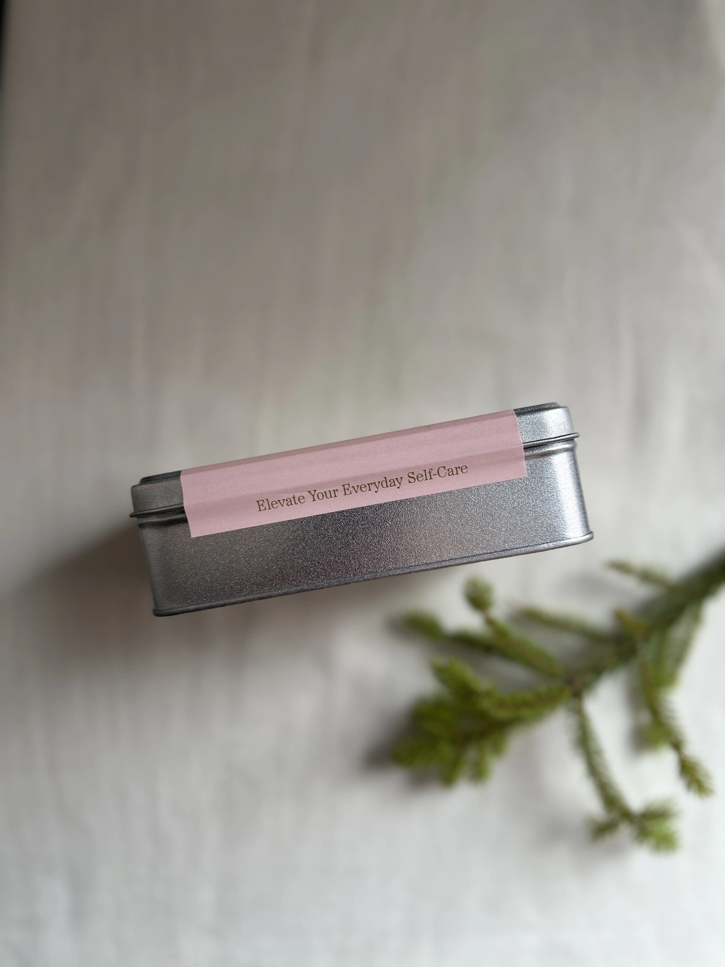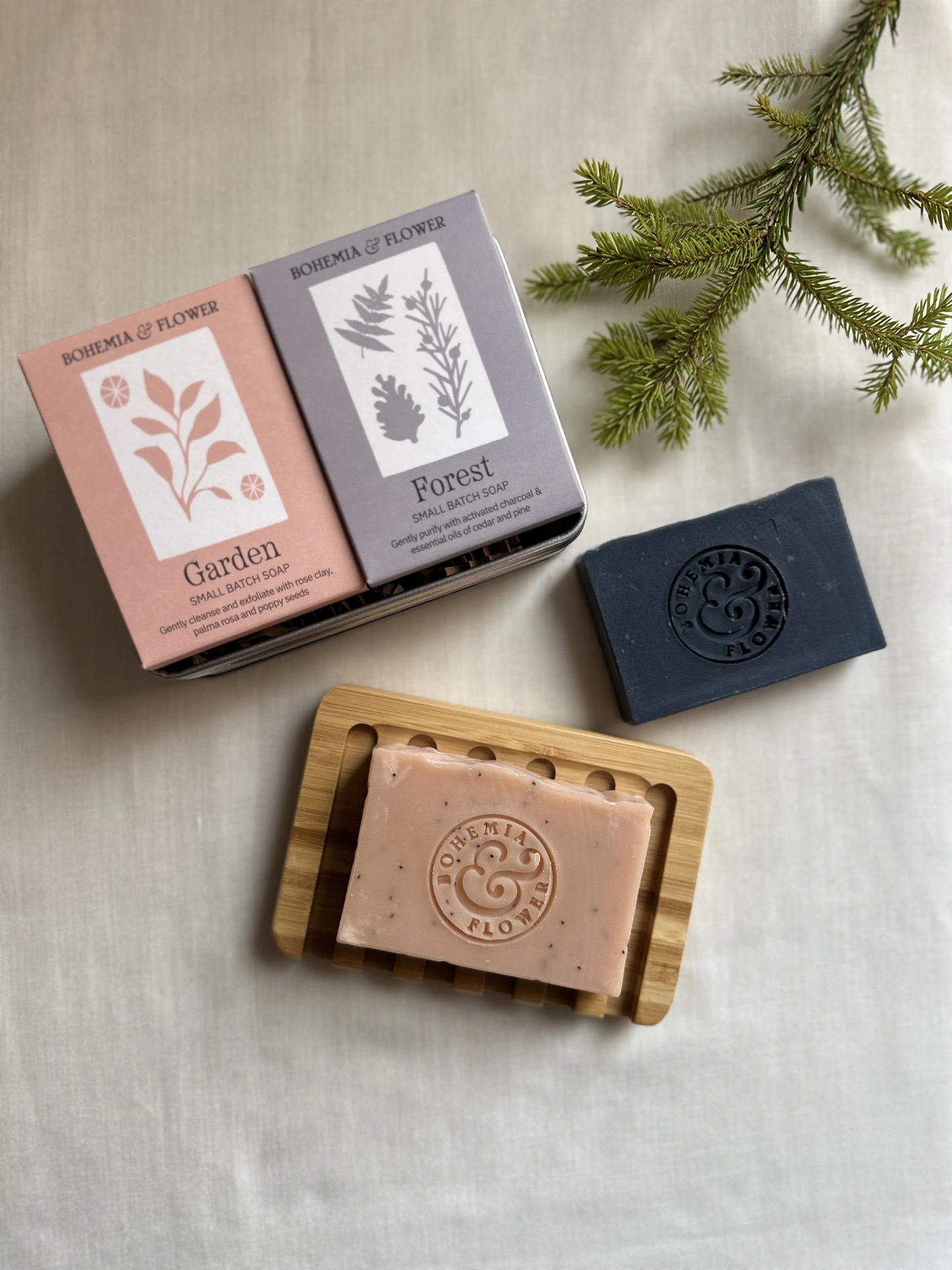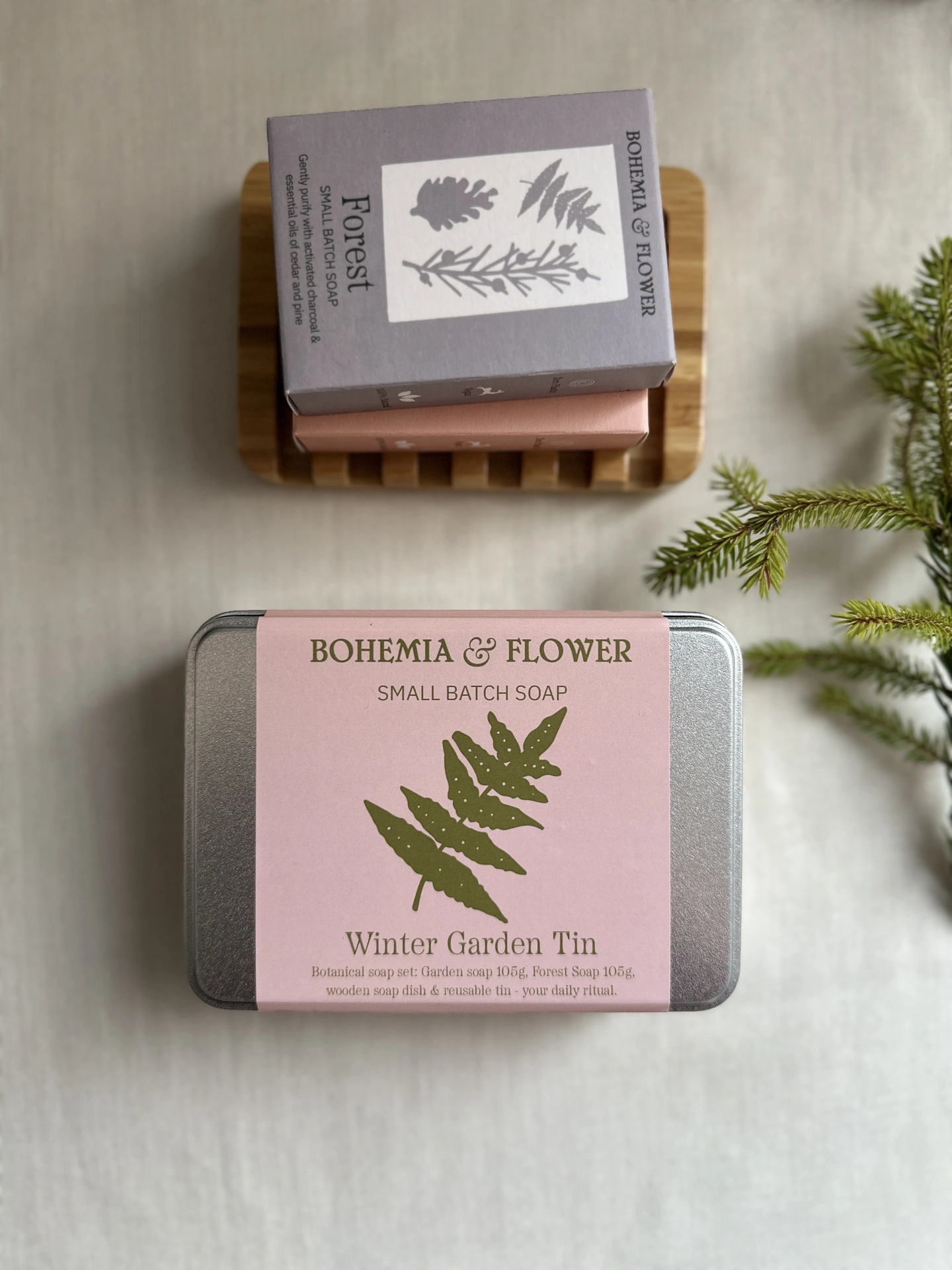 Inside the reusable tin you’ll find two of my small-batch soaps: Forest, with its resinous blend of cedarwood, juniper, rosemary and pine and Garden, a gentle exfoliating bar made with pink clay, poppy seeds, lavender and palmarosa. They’re paired with a handcrafted wooden soap dish to help each bar dry beautifully and last longer.