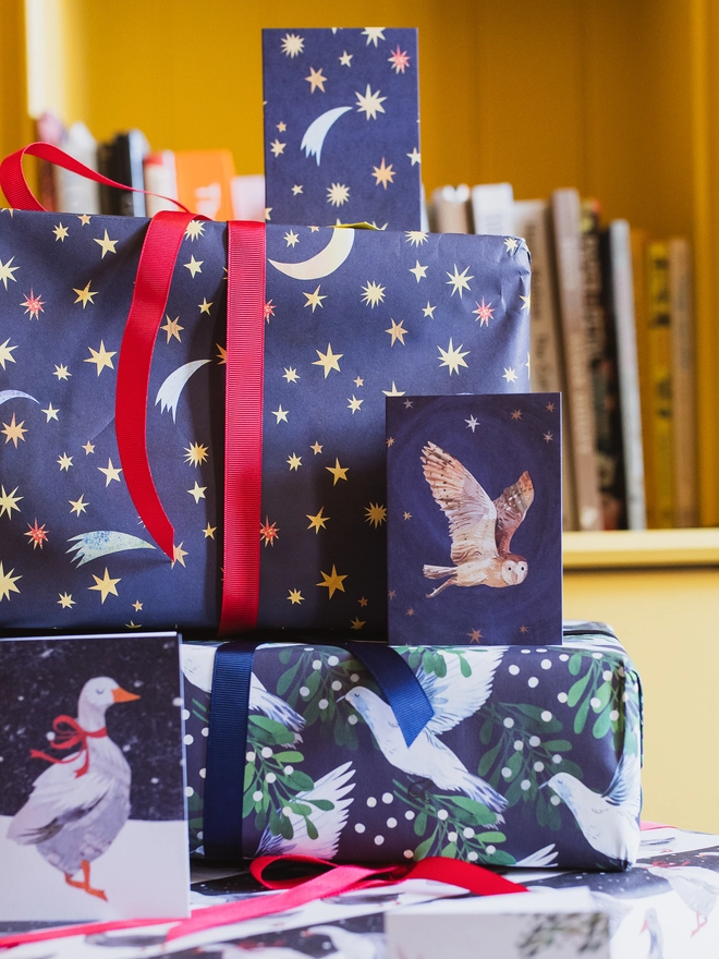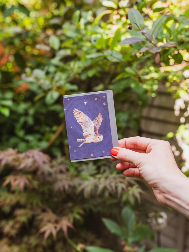 Share a little winter wonder this Christmas with this charming mini card featuring a barn owl gliding through a starlit night sky. The original artwork was lovingly created by Kate Slater, using her signature handmade collage technique.