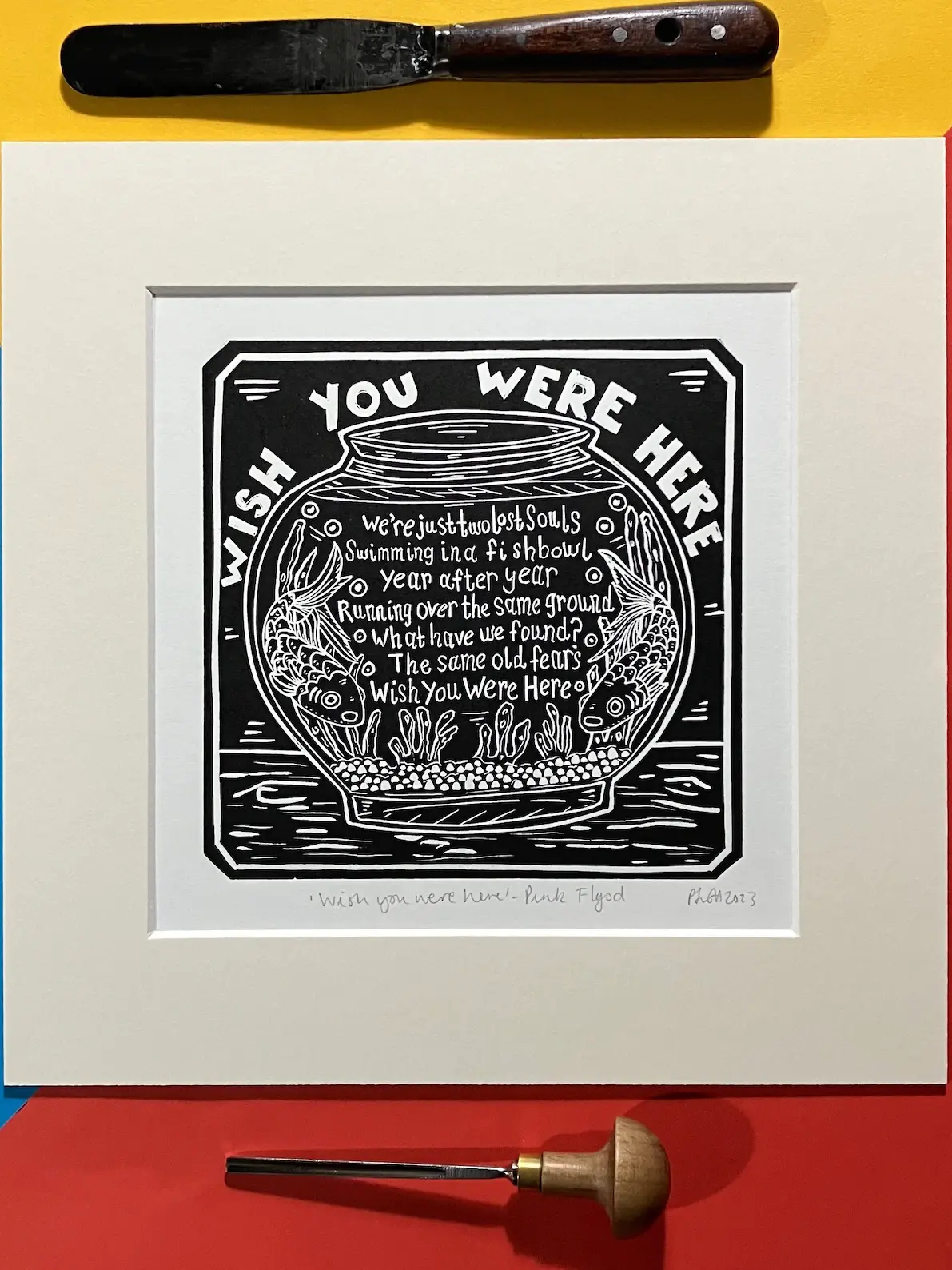 'Wish You Were Here': Pink Floyd Lyric Linocut Print